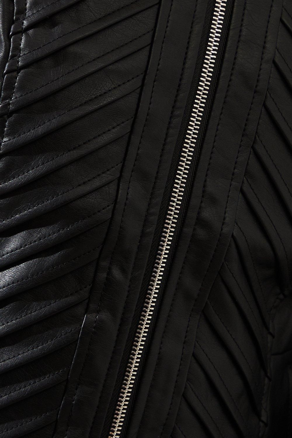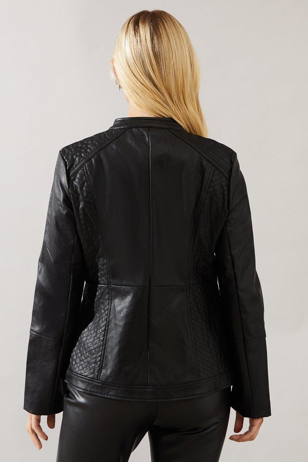 The black leather jacket is a stylish and versatile addition to any wardrobe. Made from faux leather, it provides the classic look and feel of genuine leather. The collarless design adds a modern touch, while the pleat detail adds a subtle yet sophisticated element. With its sleek black color, this jacket is the perfect choice for effortlessly elevating any outfit.
