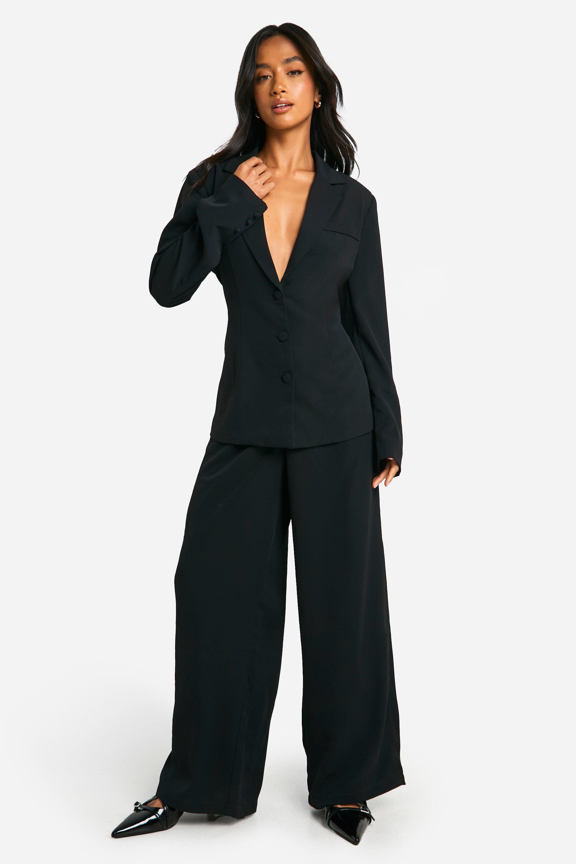 - This chic petite jacket from Boohoo is a versatile addition to any wardrobe. The ruched waist detail creates a feminine silhouette, while the tailored fit ensures a polished look. Style it with wide-leg trousers and pointed flats for a sophisticated daytime ensemble. For a more casual vibe, pair it with high-waisted jeans and trainers. The jacket's adaptability makes it perfect for family gatherings, brunches with friends, or casual office days. Layer it over a simple camisole or a crisp white shirt to create different looks. The woven crepe fabric offers comfort and ease of movement, making it ideal for busy days when you need to look put-together without sacrificing comfort. This jacket is a true wardrobe staple that will see you through multiple seasons and occasions with effortless style.