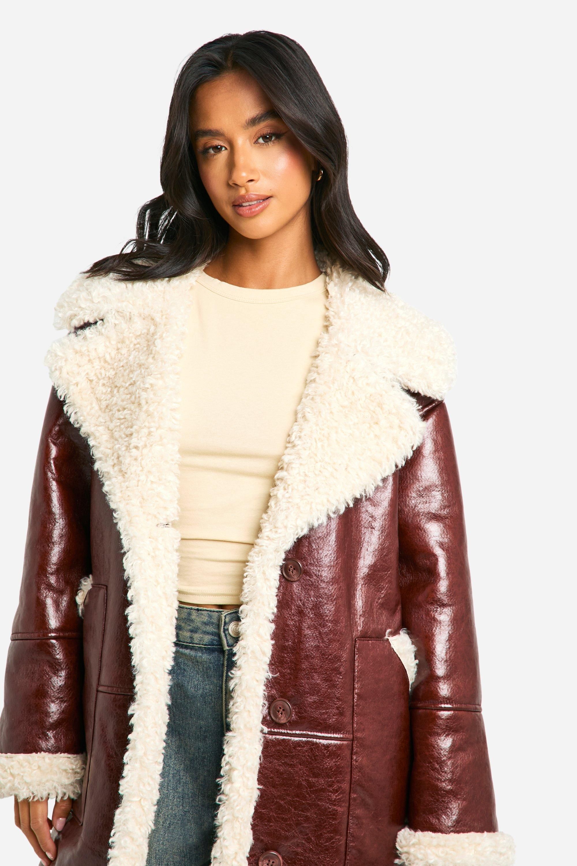 - Make a statement this season with our eye-catching petite faux leather aviator jacket. The contrasting teddy lining not only adds warmth but also creates a visually striking effect that's sure to turn heads. Perfect for those chilly autumn days or cool spring evenings, this versatile piece can be styled for various casual occasions. Layer it over a simple jumper and pair with wide-leg jeans and trainers for a relaxed weekend look. For a night out with friends, throw it over a fitted dress and ankle boots to add an edgy twist to your ensemble. The oversized fit allows for easy layering, making it ideal for unpredictable British weather. Whether you're heading to a family gathering or a casual coffee date, this jacket will keep you cosy and stylish. Its unique blend of rugged exterior and soft interior makes it a standout piece in any wardrobe, perfect for the fashion-forward Boohoo girl who wants to stay ahead of the trends.