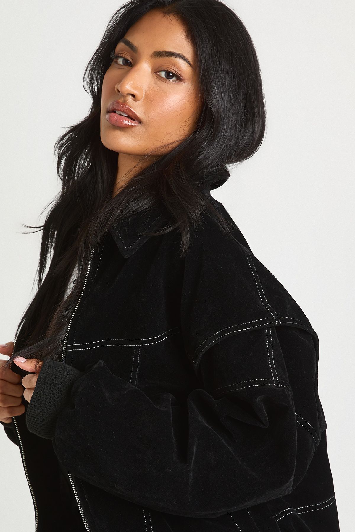 - This petite faux suede bomber jacket brings effortless cool to your casual wardrobe. The striking contrast stitching creates visual definition against the soft-touch fabric, whilst the relaxed fit ensures comfort without compromising on style. Perfect for those in-between season days, layer it over a simple crop top and wide-leg trousers as seen on our model for an on-trend look that works for coffee dates or weekend shopping trips. Add trainers and a cap for a sporty twist, or dress it up with boots and statement jewellery for evening drinks. The versatile design makes it an ideal throw-on piece for family gatherings or casual meet-ups with friends. This Boohoo bomber is designed specifically for petite frames, ensuring the proportions work perfectly for your silhouette without overwhelming your frame.