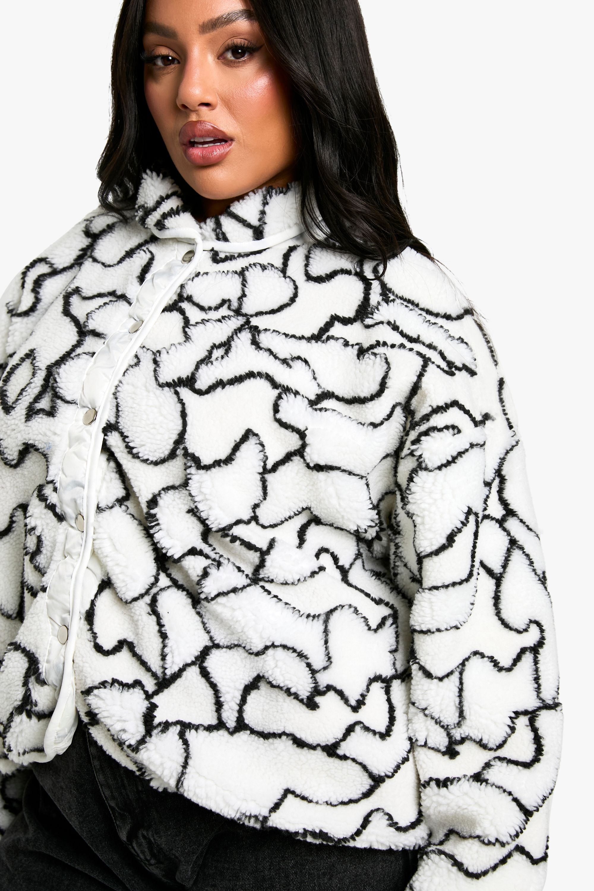 - Make a bold statement with this striking plus-size teddy jacket featuring an attention-grabbing abstract print. The boxy, oversized silhouette offers a contemporary edge while ensuring ample room for layering. Perfect for those chilly days, this jacket combines warmth with style effortlessly. As seen on our model, pair it with a simple white top and wide-leg trousers for a chic, balanced look. The button-up front allows for easy wear and styling versatility. Whether you're heading to a casual family gathering or meeting friends for coffee, this jacket is sure to turn heads. Accessorise with a large tote bag to complete your ensemble. The plush texture adds an extra element of cosiness, making it an ideal choice for those seeking both comfort and fashion-forward appeal in their outerwear.