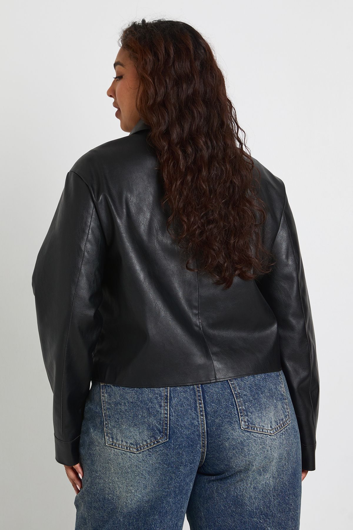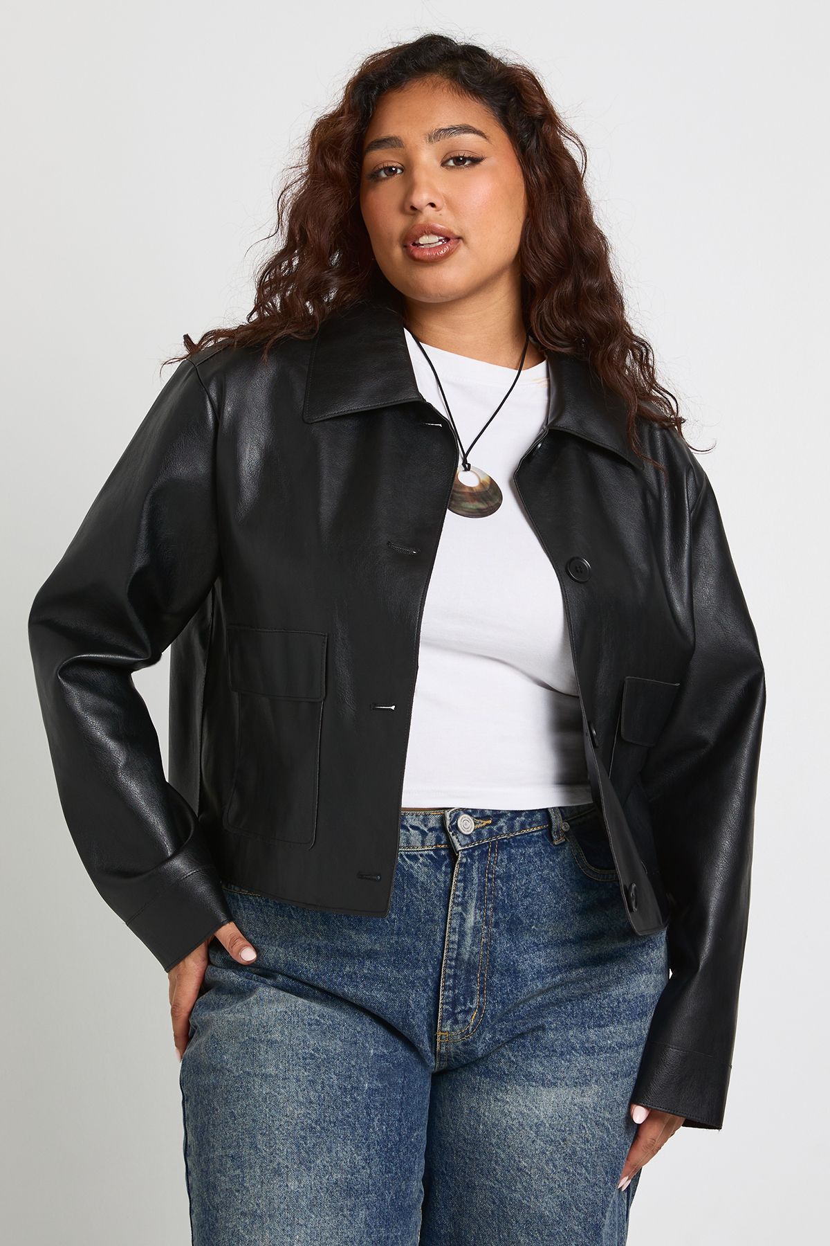 • Smooth finish with a contemporary edge for versatile styling This plus size collared jacket brings effortless edge to your casual wardrobe. The cropped length creates a flattering silhouette that works brilliantly with high-waisted jeans, as styled in the image. The button-down front offers adjustable coverage, whilst the structured collar adds a touch of sophistication to this otherwise relaxed piece. Perfect for family gatherings or weekend brunches, this jacket can be styled with a simple white tee and your favourite denim for an understated look. For cooler evenings, layer over a lightweight jumper and pair with wide-leg trousers and trainers. The versatile design transitions seamlessly from day to night - simply swap your casual footwear for ankle boots and add statement jewellery for evening drinks with friends. A true Boohoo staple that combines practicality with on-trend appeal.