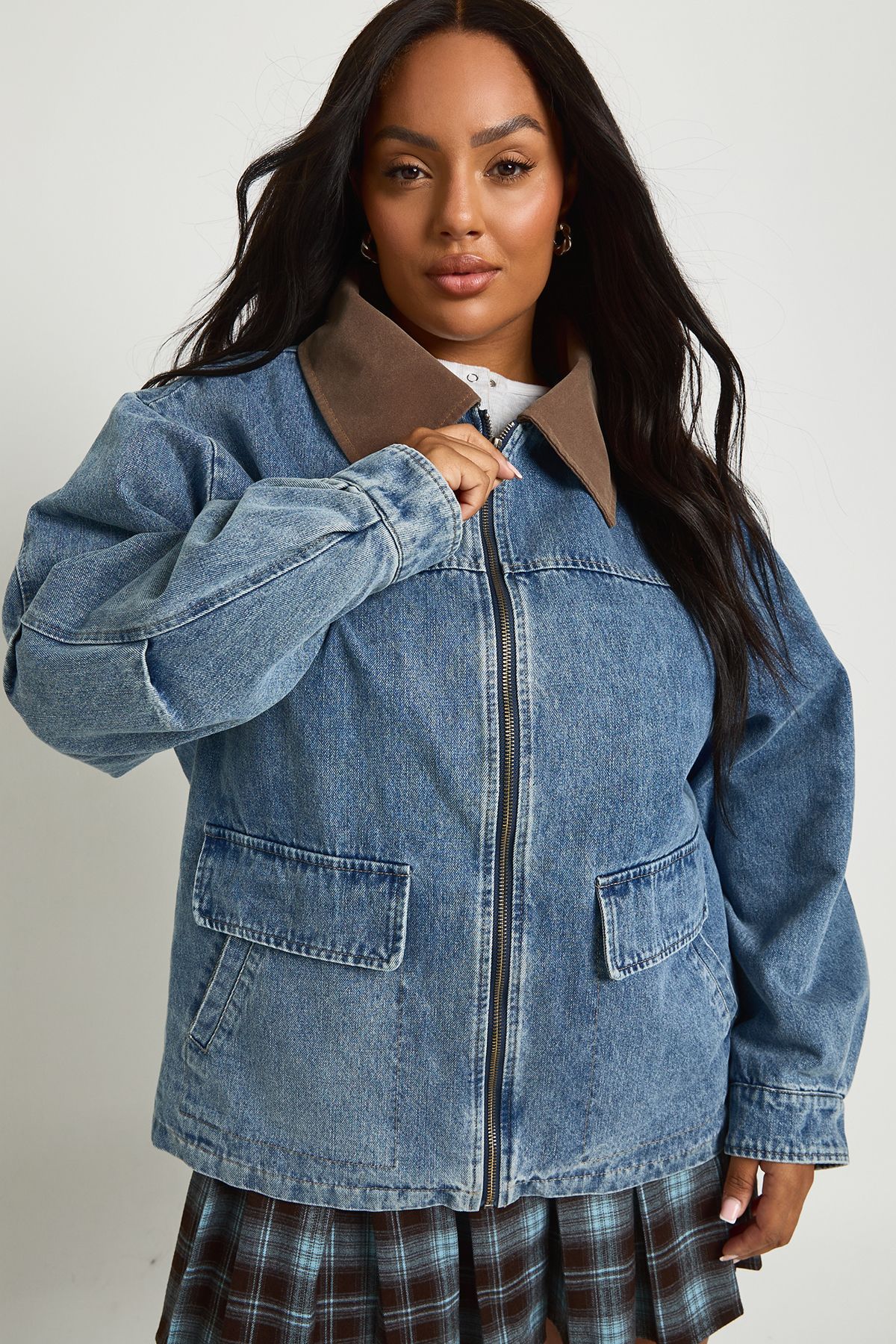 - Make a statement with this trendy oversized denim bomber jacket, perfect for adding an effortlessly cool edge to your casual wardrobe. The contrasting collar adds a distinctive touch to this relaxed piece, while the roomy fit allows for comfortable layering over jumpers during cooler months. Style with a simple white top and checked mini skirt as shown for a playful daytime look, or pair with straight-leg jeans and trainers for weekend coffee dates. The versatile design works brilliantly with knee-high boots for autumn outings or with canvas shoes for casual summer evenings. This Boohoo bomber combines practicality with on-trend styling, making it an essential piece for family gatherings, shopping trips or casual meet-ups with friends. The denim construction ensures durability while maintaining that coveted lived-in look that improves with wear.