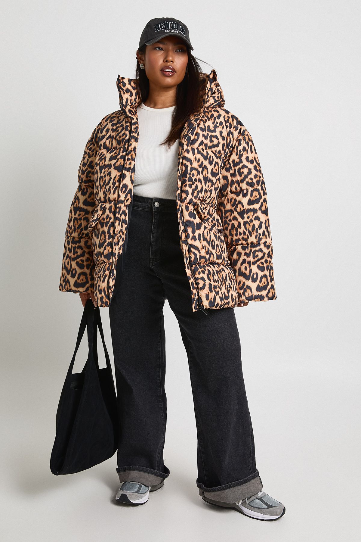 • Oversized quilted jacket with bold leopard print