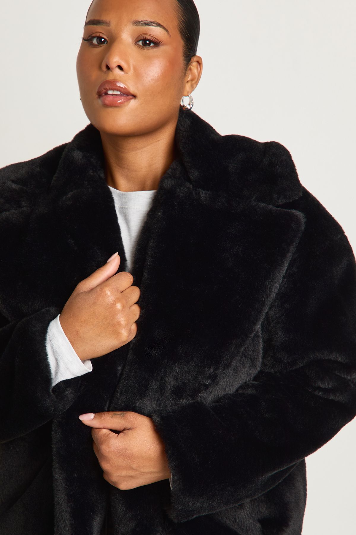 • Long sleeves with slightly dropped shoulders for a modern silhouette Embrace the chilly season with this statement-making faux fur jacket. Its mid-length design offers the perfect balance of cosiness and style, making it an ideal choice for various casual occasions. The oversized collar adds a touch of drama, while the relaxed fit ensures comfort for all-day wear. Style this eye-catching piece with sleek faux leather trousers and a simple top for a chic contrast, or pair it with your favourite jeans and trainers for a more laid-back look. Whether you're heading to a family gathering or meeting friends for a casual night out, this jacket will keep you warm and fashionable. Its versatility allows for endless styling options, making it a must-have addition to your autumn and winter wardrobe.