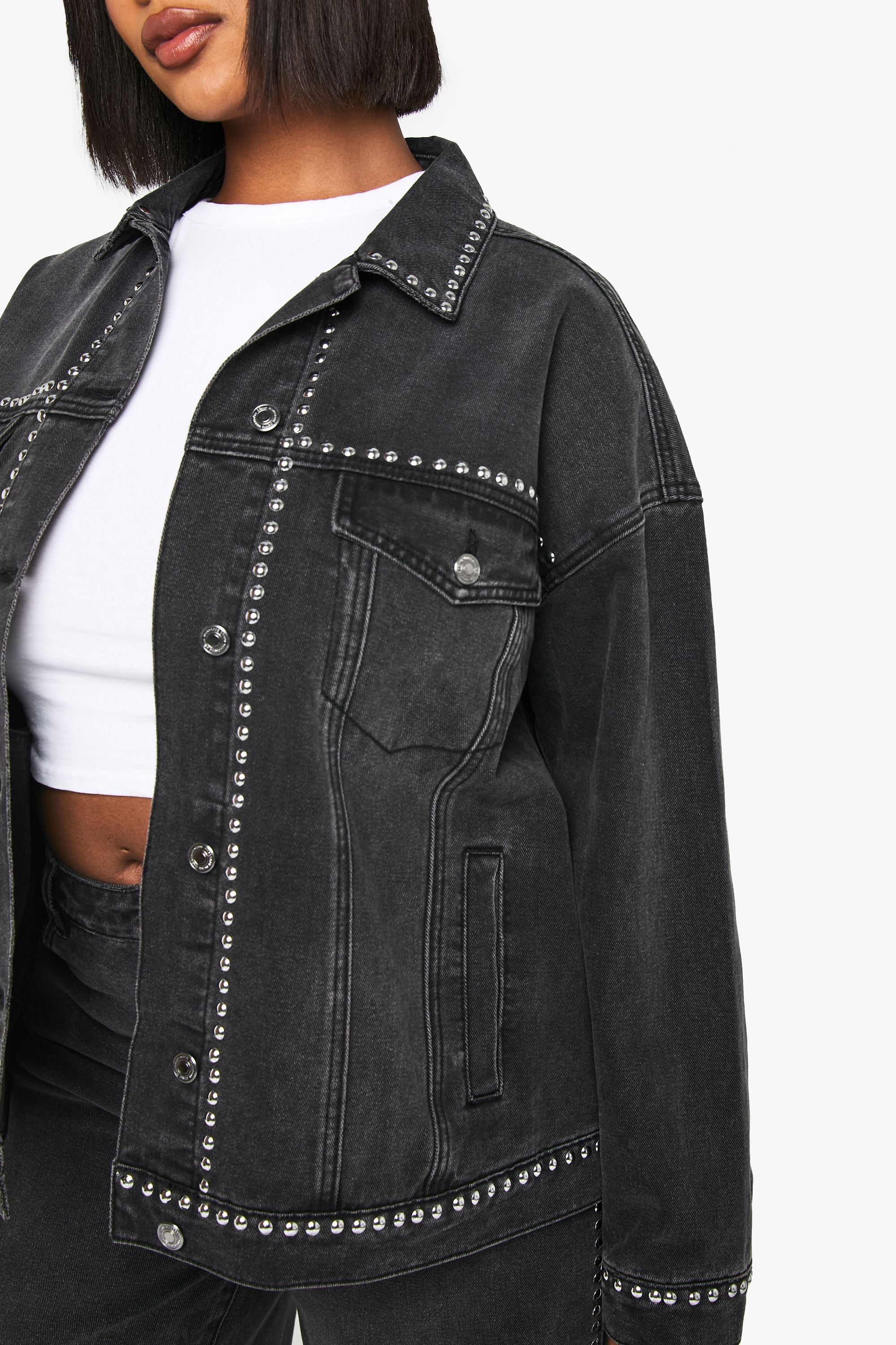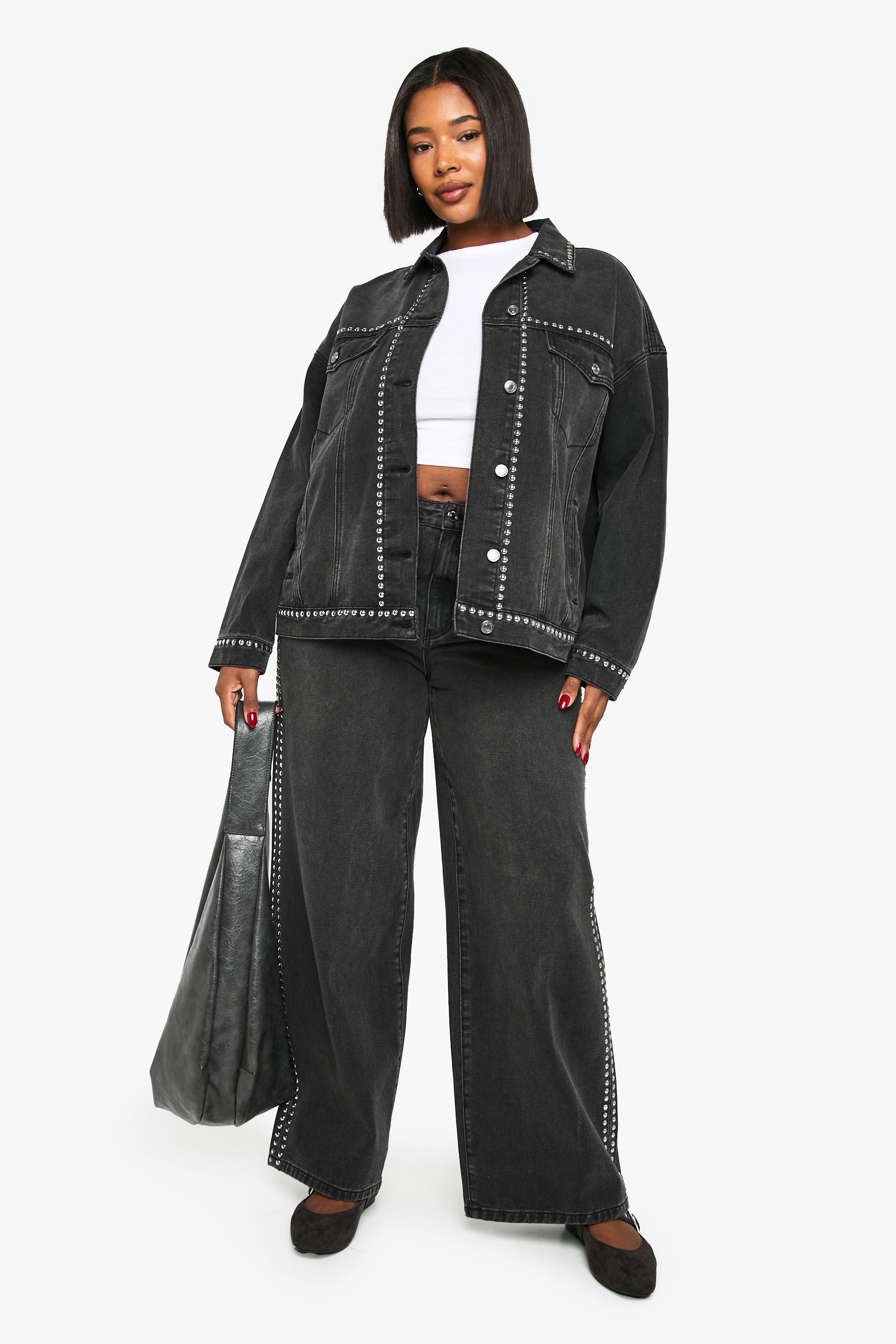 - Make a striking impression with this Boohoo Plus Studded Denim Jacket, where classic denim meets contemporary edge. The distinctive stud detailing creates visual interest while maintaining a casual vibe that works for everyday wear. Style it as seen with a simple white crop top and matching wide-leg denim trousers for a coordinated denim-on-denim ensemble that's right on trend. This jacket works brilliantly for casual outings, family gatherings or weekend brunches-simply throw it over a floral dress with trainers for a contrasting feminine-meets-edgy look, or pair with your favourite jeans and a graphic tee for an effortlessly cool vibe. The relaxed silhouette ensures comfort whilst the structured denim provides just enough shape to create a flattering outline. A true wardrobe hero that adds attitude to any casual outfit.