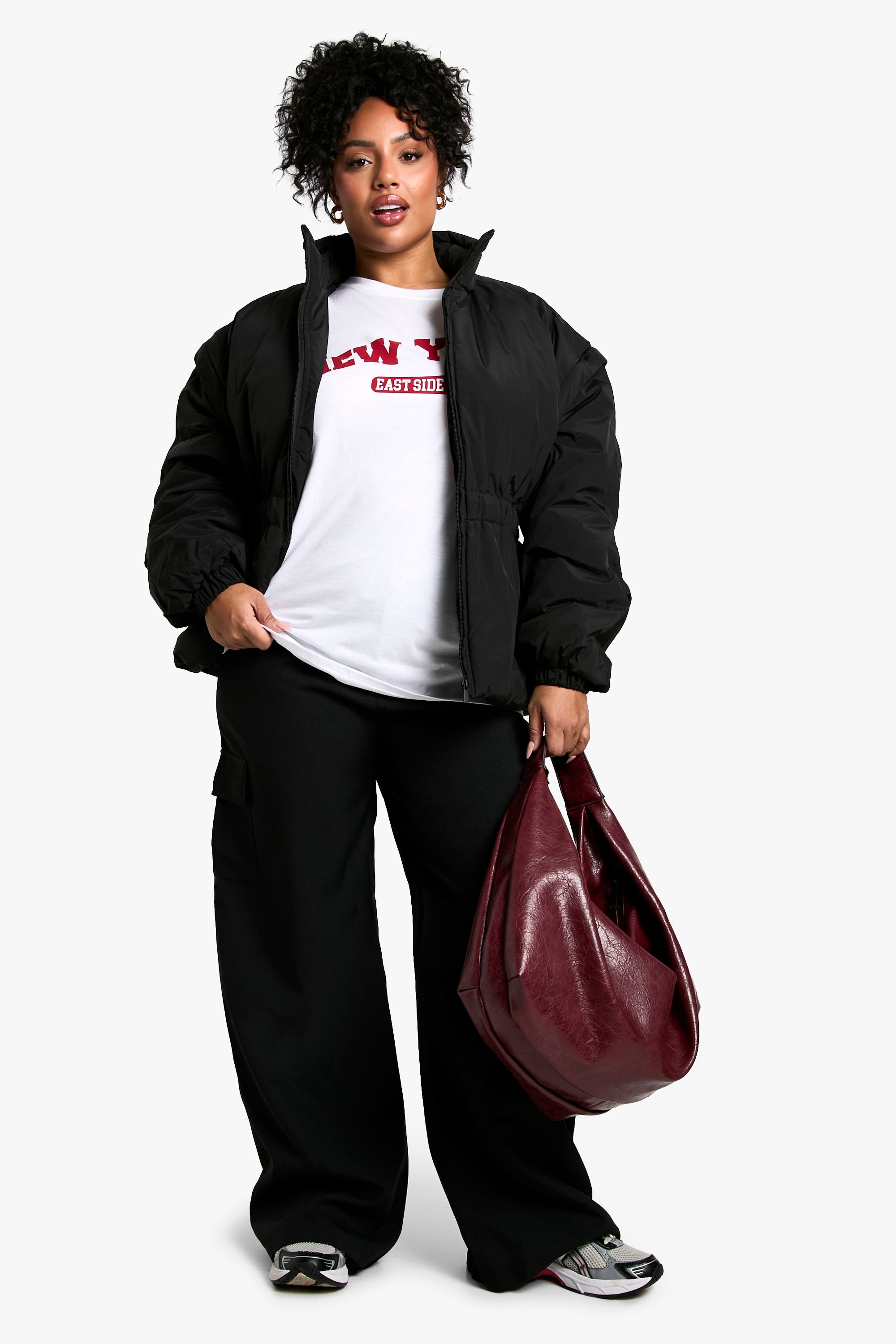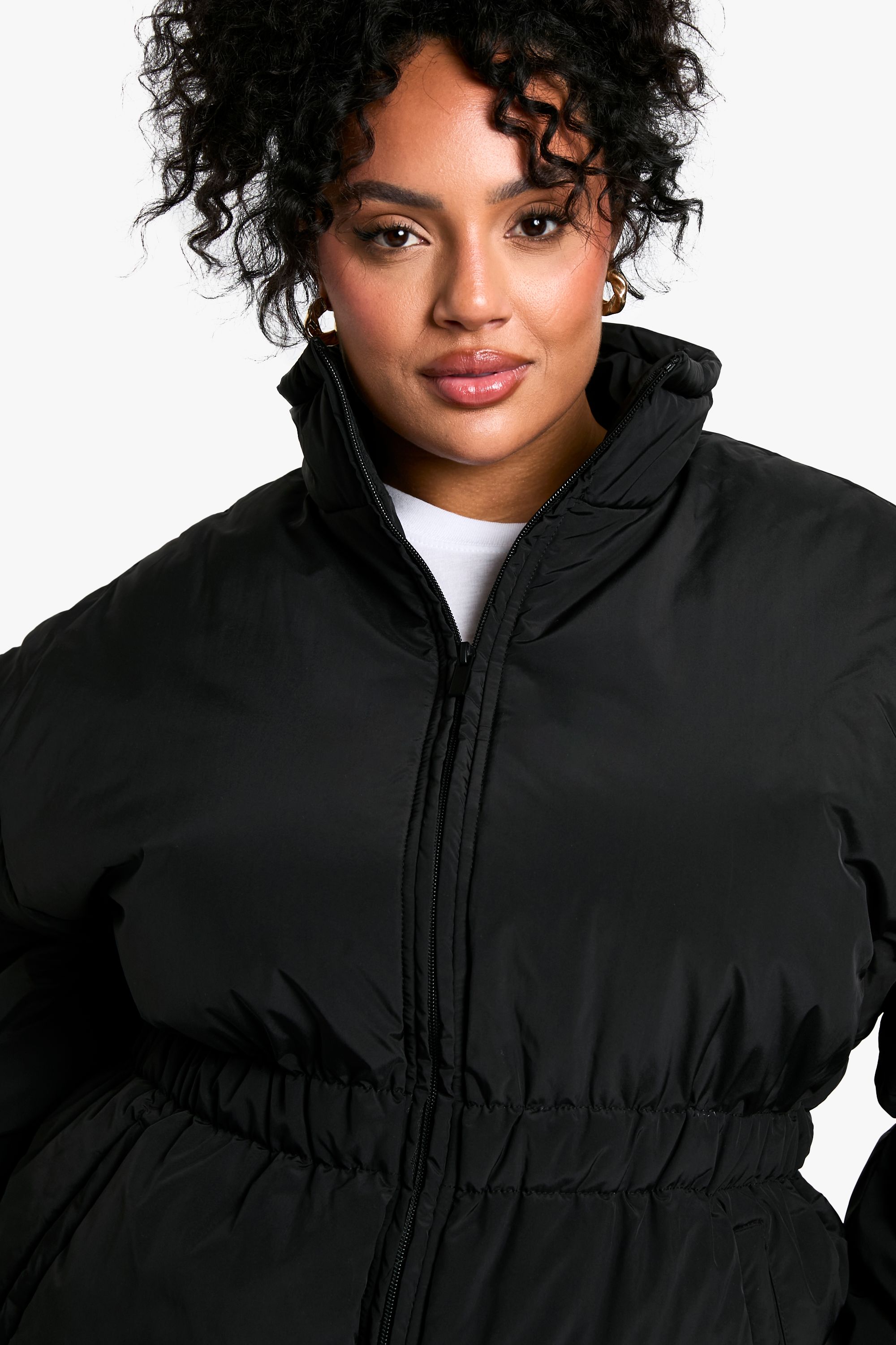 - This plus-size quilted jacket is the perfect addition to your autumn and winter wardrobe. The gathered waist detail adds a touch of femininity to the practical design, creating a flattering shape that complements curves beautifully. Style it with wide-leg trousers and trainers for a laid-back weekend look, or throw it over a casual dress and ankle boots for family gatherings. The high collar and full-length zip provide excellent protection against chilly winds, making it ideal for outdoor activities or running errands in cooler weather. For a trendy twist, pair it with a graphic tee, your favourite jeans, and a roomy handbag for a stylish ensemble that's both comfortable and fashion-forward. This Boohoo jacket is a versatile piece that will quickly become your go-to outerwear for casual outings and relaxed social events.