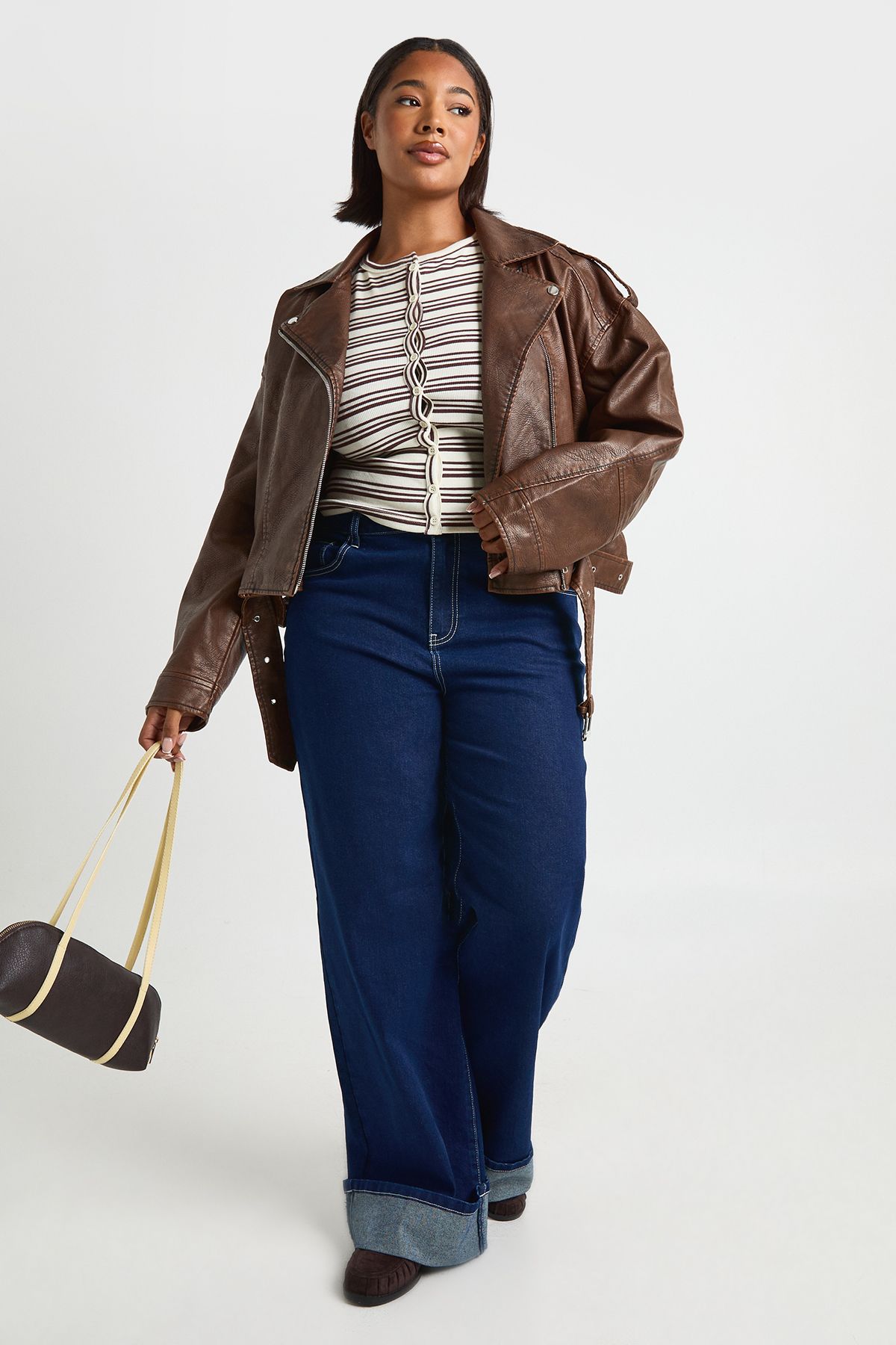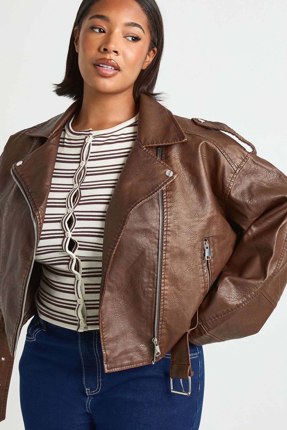 - Embrace your inner rebel with this Plus Vintage Faux Leather Crop Biker Jacket from Boohoo. This timeless piece combines classic biker style with a modern cropped silhouette, perfect for the fashion-forward woman who wants to make a statement. The jacket's versatility shines through in its styling potential - pair it with high-waisted cargo trousers and a simple white tee for a casual daytime look, or throw it over a flowy dress for an unexpected edge at family gatherings. The belted hem allows for customisation, letting you cinch in your waist or leave it loose for a more relaxed vibe. Whether you're heading to a casual lunch with friends or a laid-back evening out, this jacket adds instant cool to any ensemble. Its regular fit ensures comfort without compromising on style, making it a go-to piece for the confident Boohoo woman who loves to stay ahead of the trends.