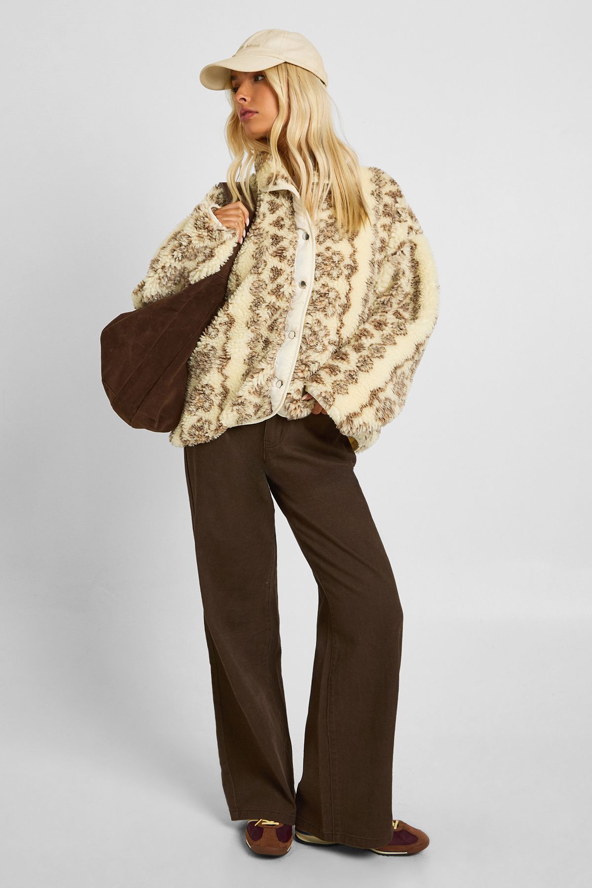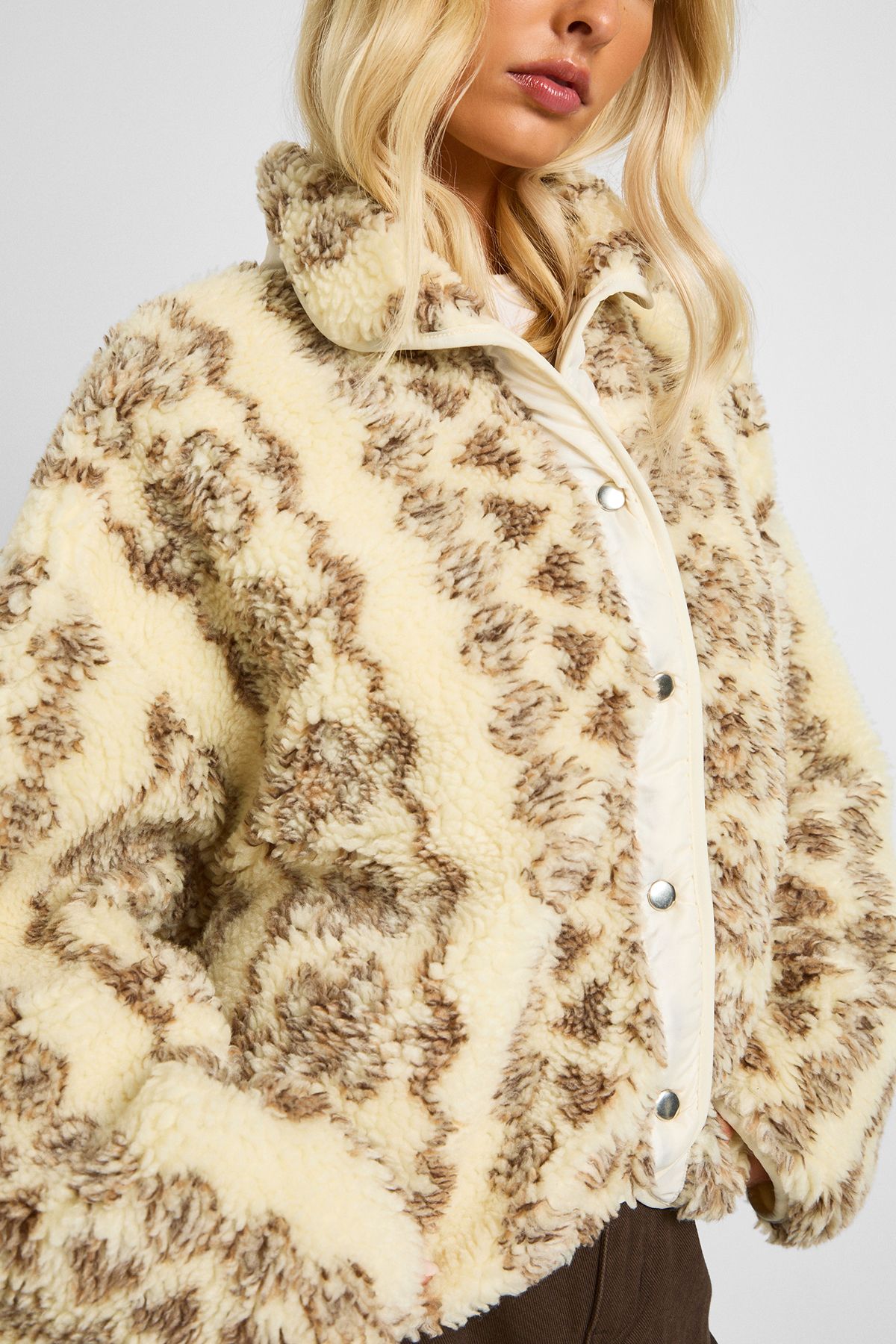 - Make a statement in this eye-catching printed teddy jacket that combines cosiness with contemporary style. The textured fabric offers exceptional warmth without compromising on fashion-forward design, whilst the relaxed silhouette creates an effortlessly chic look. Style with wide-leg trousers and chunky boots as shown for a balanced casual ensemble perfect for weekend brunches or shopping trips with friends. For a more laid-back approach, pair with your favourite jeans and trainers. This versatile piece works brilliantly for family gatherings or casual coffee dates when the temperature drops. The button-up design allows for adaptable styling-wear fully fastened for maximum warmth or open over a simple tee for a more relaxed feel. A must-have addition to your autumn-winter wardrobe that will quickly become your go-to outerwear for casual occasions.