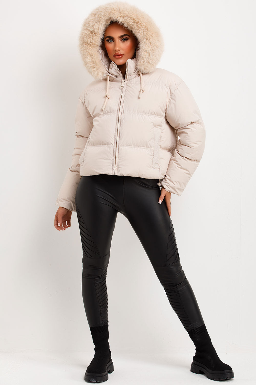 Puffer jacket with fur hood. This fur hood jacket is sure to be perfect addition for your outerwear wardrobe. Featuring faux fur hood puffer jacket with zip fastening pockets drawstring hem extremely warm wind proof padded weather resistant and premium quality. This fur hood puffer jacket is perfect to complete you new season look. This puffer jacket with faux fur hood is also available in other colours.