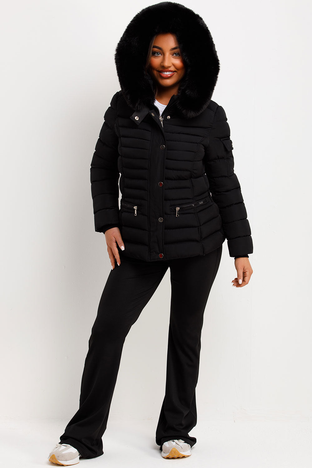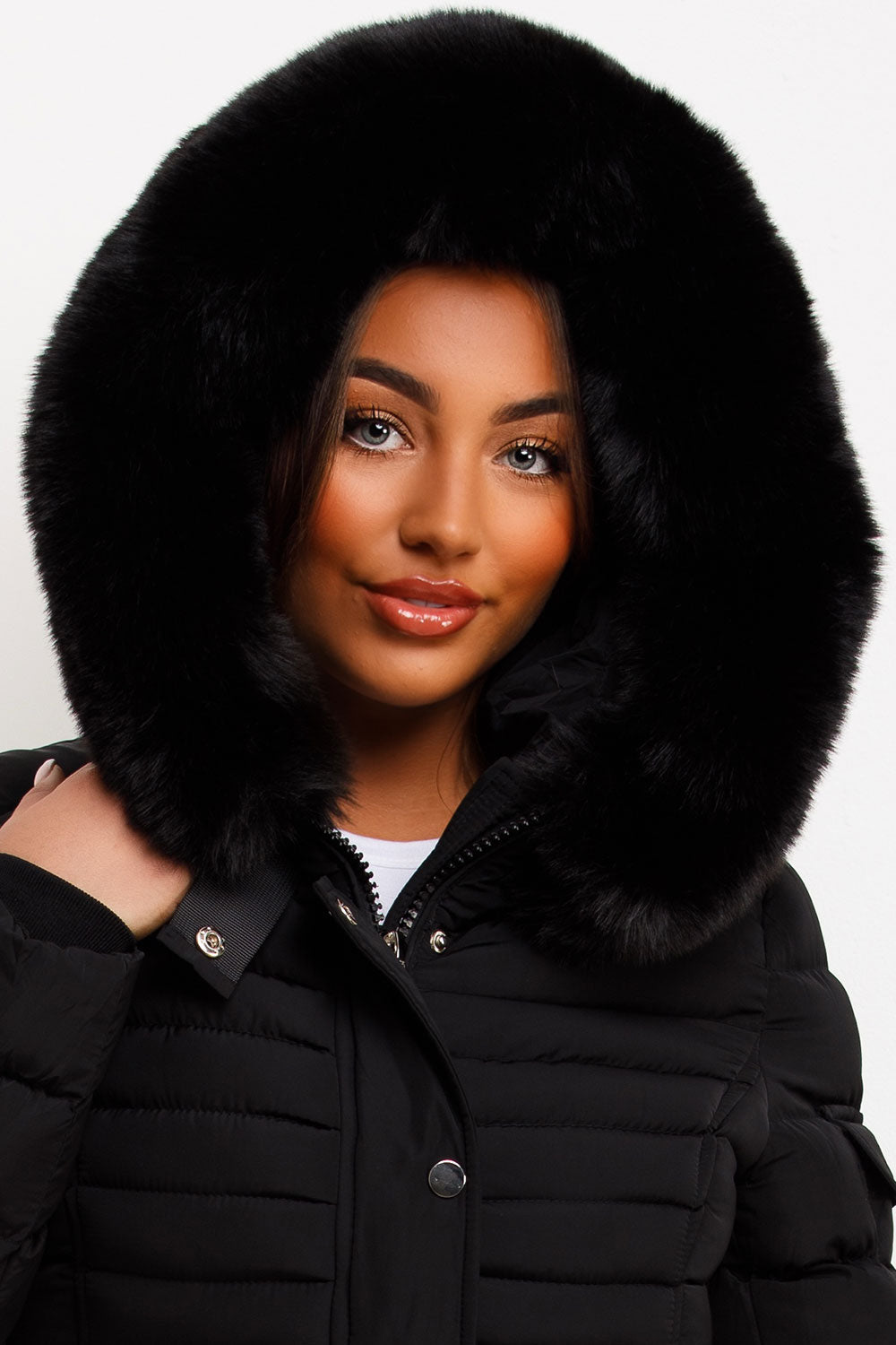 Puffer padded jacket with faux fur hood. This fur hood puffer jacket is a must have for your outerwear wardrobe. Featuring weather resistant puffer padded quilted jacket with premium faux fur hood zip fastening secure pockets and side buckle detail, this hooded puffer jacket is extremely warm and wind proof. Style this faux fur hooded puffer jacket with any outfit to complete your outerwear look. This puffer jacket with faux fur hood is also available in other colours.