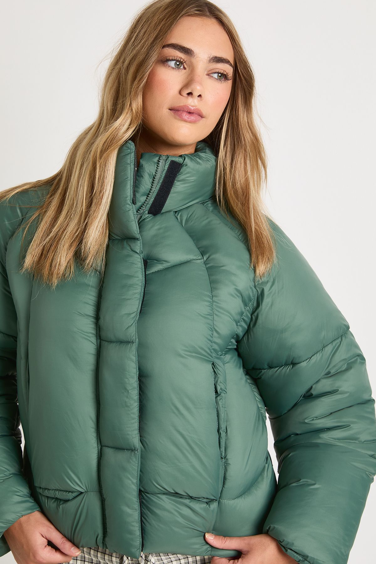 - Embrace the chilly weather in style with this eye-catching quilted jacket. The trendy cropped silhouette adds a modern twist to the classic puffer style, making it a must-have for your autumn and winter wardrobe. Perfect for casual outings, this jacket pairs effortlessly with your favourite jeans and trainers for a laid-back look. Layer it over a cosy jumper for extra warmth during weekend brunches or family gatherings. The high collar and practical zip pockets offer both style and functionality, ensuring you stay comfortable and chic. For a fashion-forward ensemble, try pairing it with wide-leg trousers and chunky boots, as seen on our model. This versatile piece is sure to become your go-to outerwear for those crisp, casual days when you want to look effortlessly cool while staying snug.