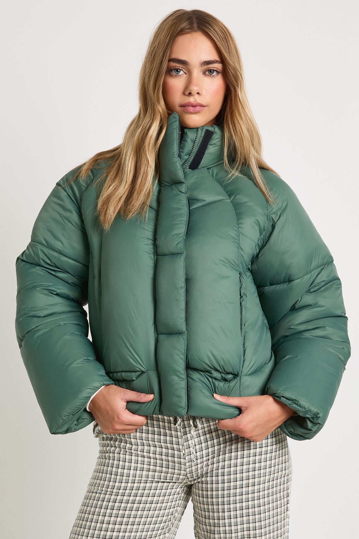 - Versatile piece suitable for various casual outfits Embrace the chilly weather in style with this eye-catching quilted jacket. The trendy cropped silhouette adds a modern twist to the classic puffer style, making it a must-have for your autumn and winter wardrobe. Perfect for casual outings, this jacket pairs effortlessly with your favourite jeans and trainers for a laid-back look. Layer it over a cosy jumper for extra warmth during weekend brunches or family gatherings. The high collar and practical zip pockets offer both style and functionality, ensuring you stay comfortable and chic. For a fashion-forward ensemble, try pairing it with wide-leg trousers and chunky boots, as seen on our model. This versatile piece is sure to become your go-to outerwear for those crisp, casual days when you want to look effortlessly cool while staying snug.