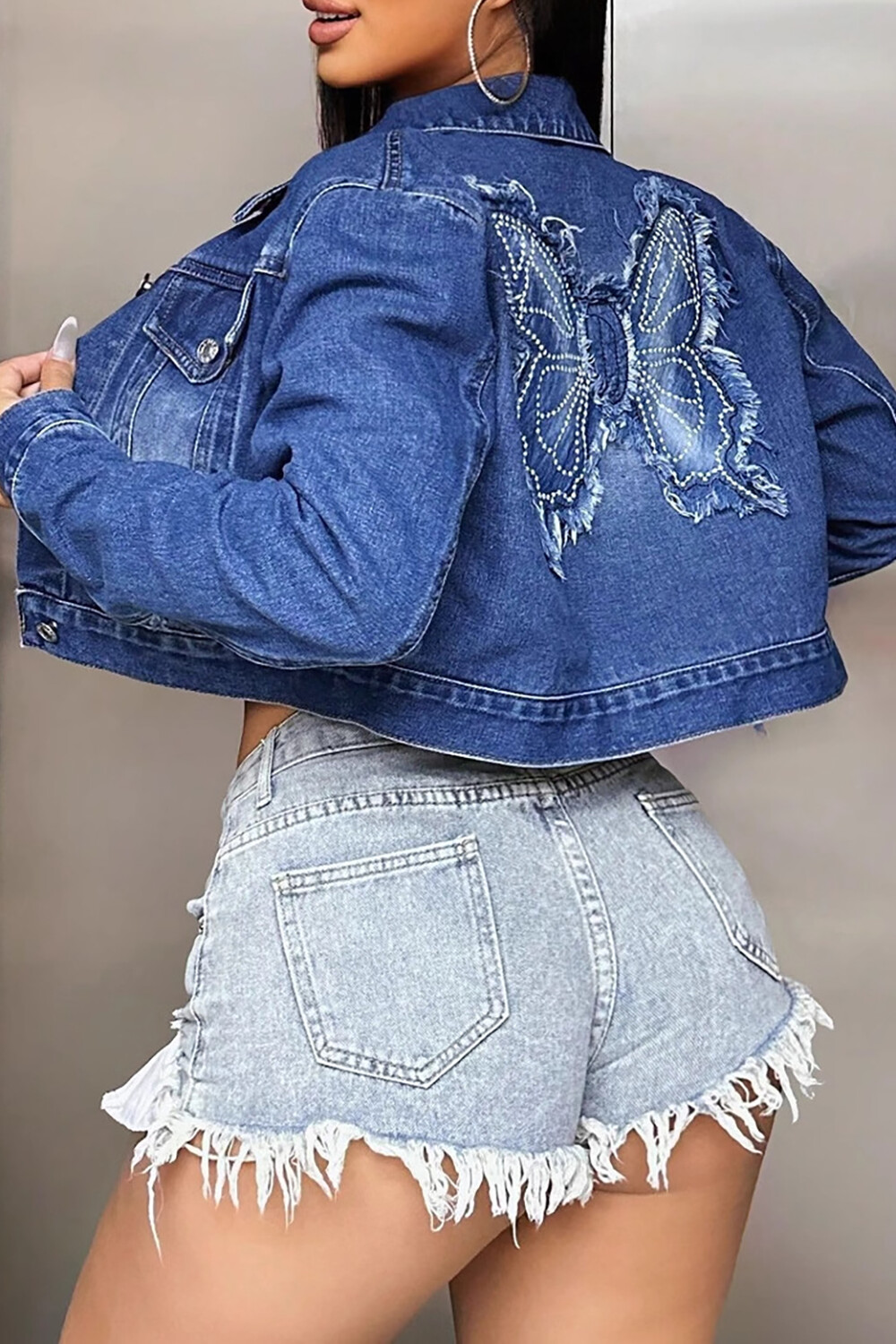 • Raw Edge Butterfly Applique Denim Long Sleeve Crop Jacket-Blue