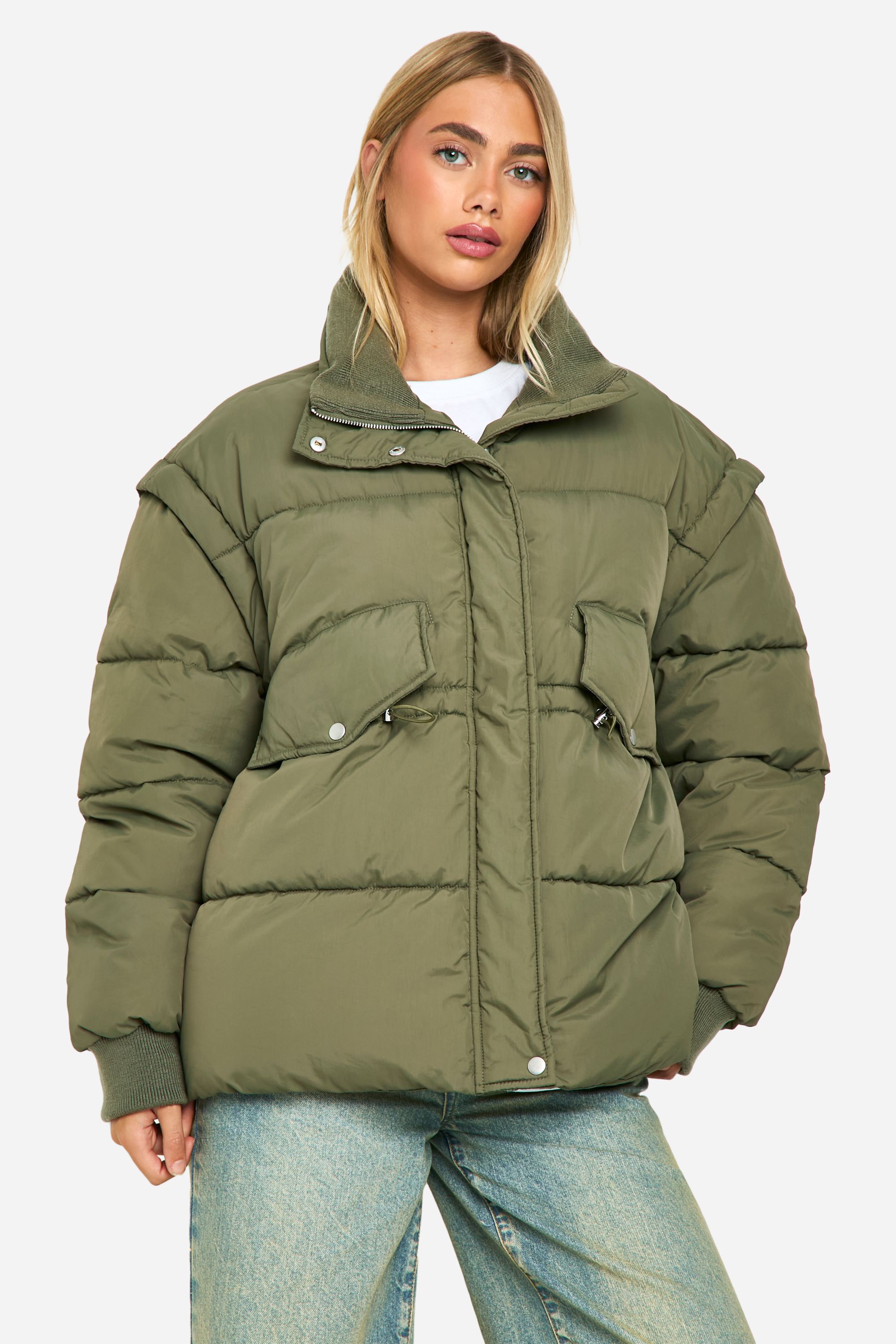 - Embrace the chilly weather in style with this trendy oversized quilted jacket. The contrasting collar adds a fashionable twist to the classic puffer design, making it a standout piece in your winter wardrobe. Perfect for casual outings, family gatherings, or weekend brunches, this jacket effortlessly combines comfort with contemporary flair. Style it as seen on our model with wide-leg jeans and trainers for an effortlessly cool look. For a more put-together ensemble, layer it over a jumper dress with ankle boots. The roomy fit allows for easy layering, making it ideal for unpredictable British weather. Whether you're running errands or meeting friends for coffee, this jacket will keep you cosy and on-trend throughout the season.