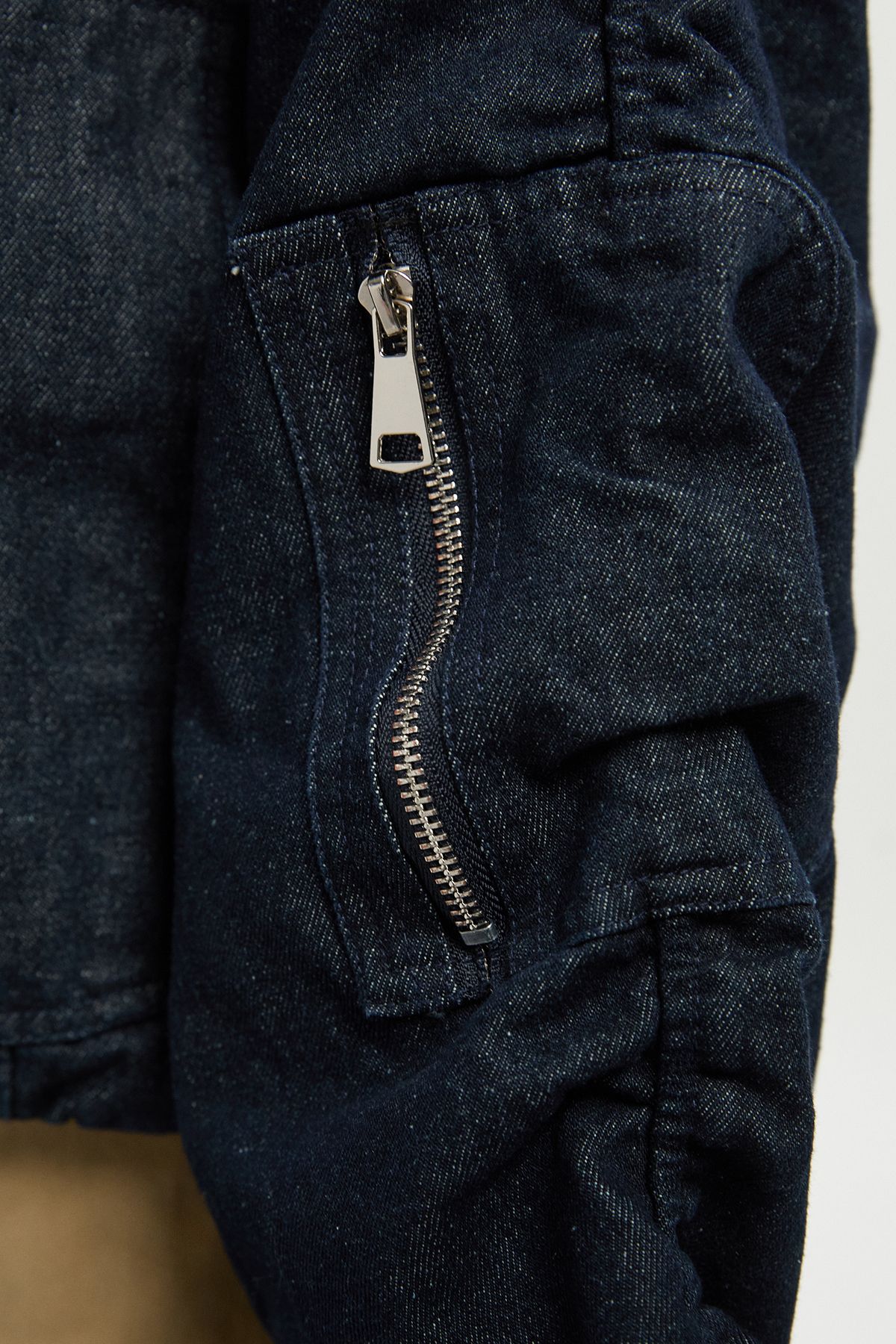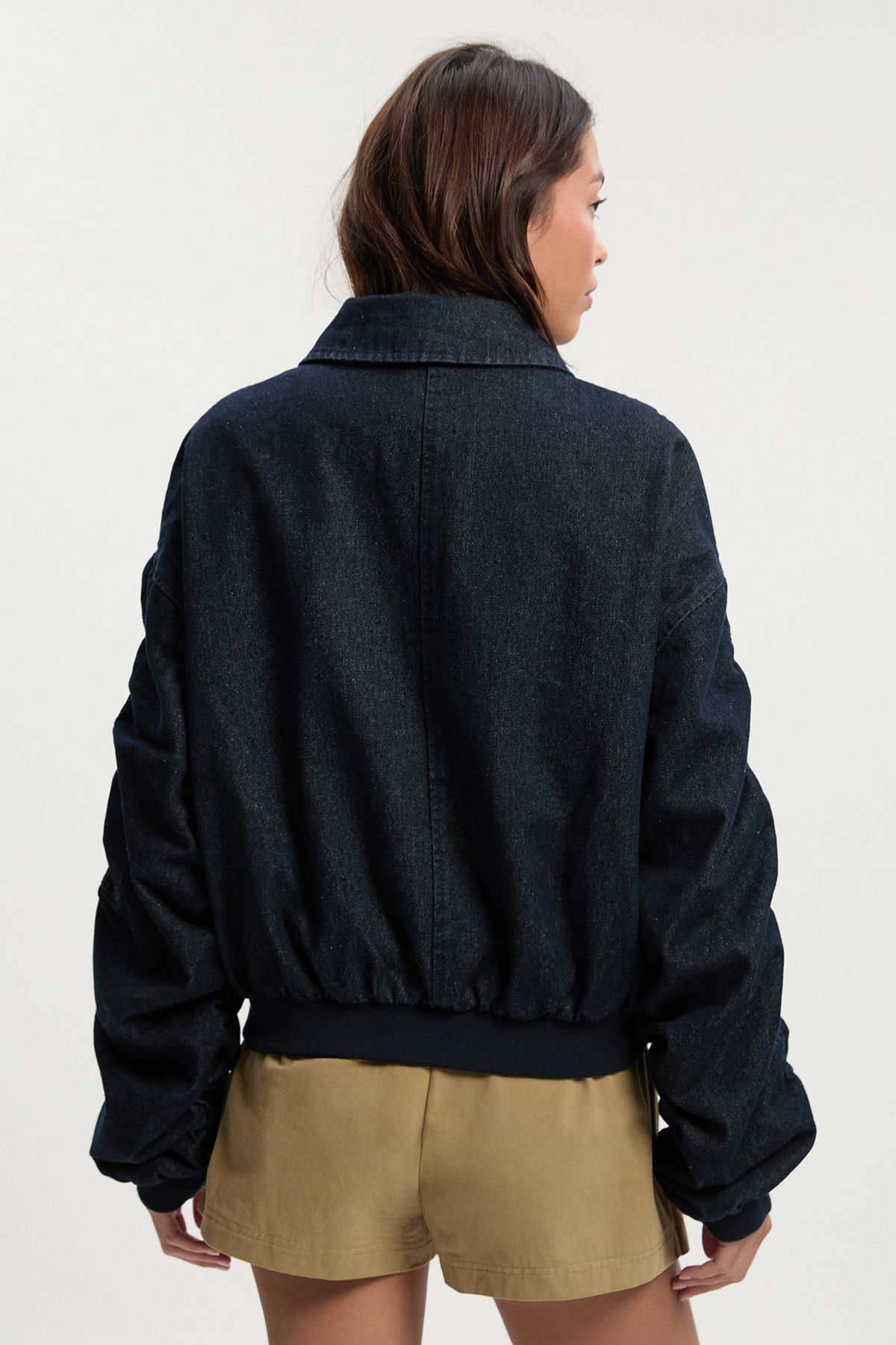 Ruched Sleeve Denim Bomber Jacket