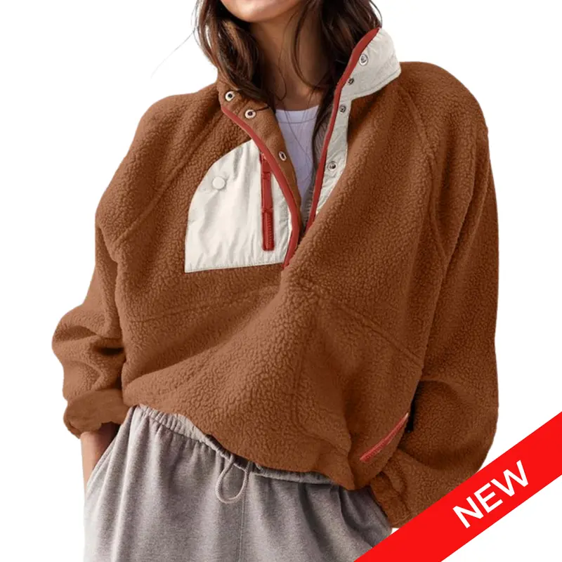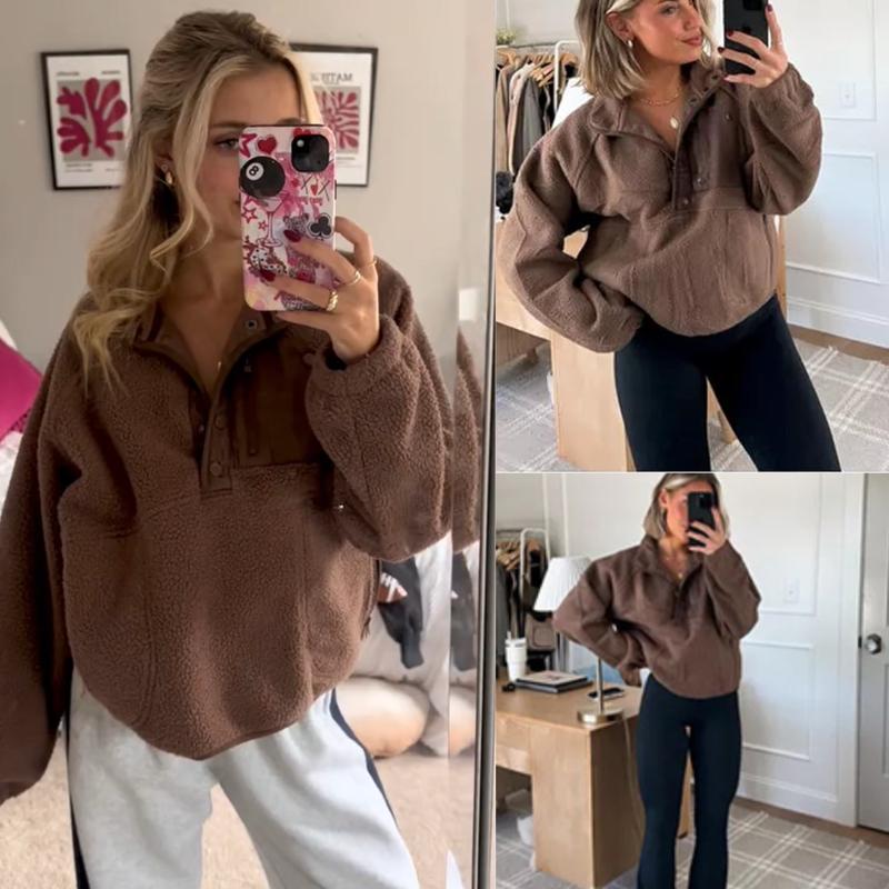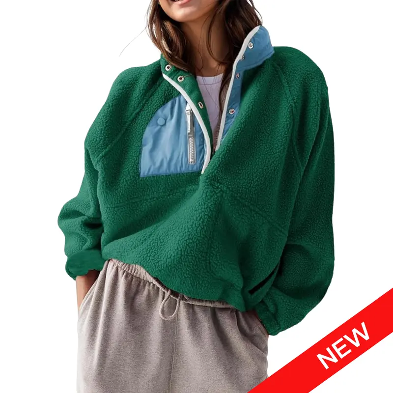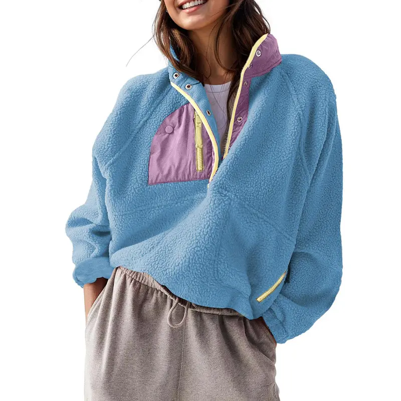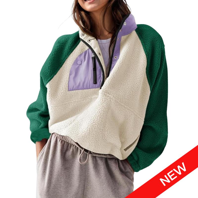 ✨ Casual and trendy, this fuzzy fleece pullover features a fashion-forward color block design. It includes a half snap button, stand collar, or lapel, raglan long sleeve, and two side zipper pockets. The cropped length and loose fit make it perfect for fall and winter. Stay cozy and stylish in this fuzzy hoodie jacket.
