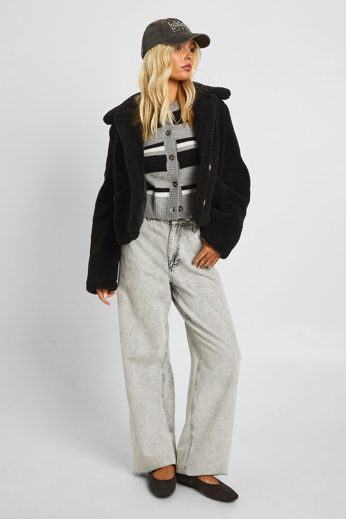 - Cropped length perfect for highlighting high-waisted bottoms This Short Fur Collared Jacket from Boohoo is the ultimate casual statement piece for your autumn-winter wardrobe. The standout fur collar frames your face beautifully whilst adding a touch of on-trend texture to any outfit. Style it as seen with wide-leg denim and a striped cardigan for an effortlessly cool daytime look, or throw it over a simple tee and your favourite jeans for coffee dates and shopping trips. The cropped silhouette works brilliantly with high-waisted trousers or skirts, creating a balanced proportion that flatters your figure. Perfect for family gatherings or weekend brunches, this jacket offers both warmth and style without compromising on comfort. Complete the look with a casual cap and flat shoes for an ensemble that's both fashionable and functional for those busy days about town.