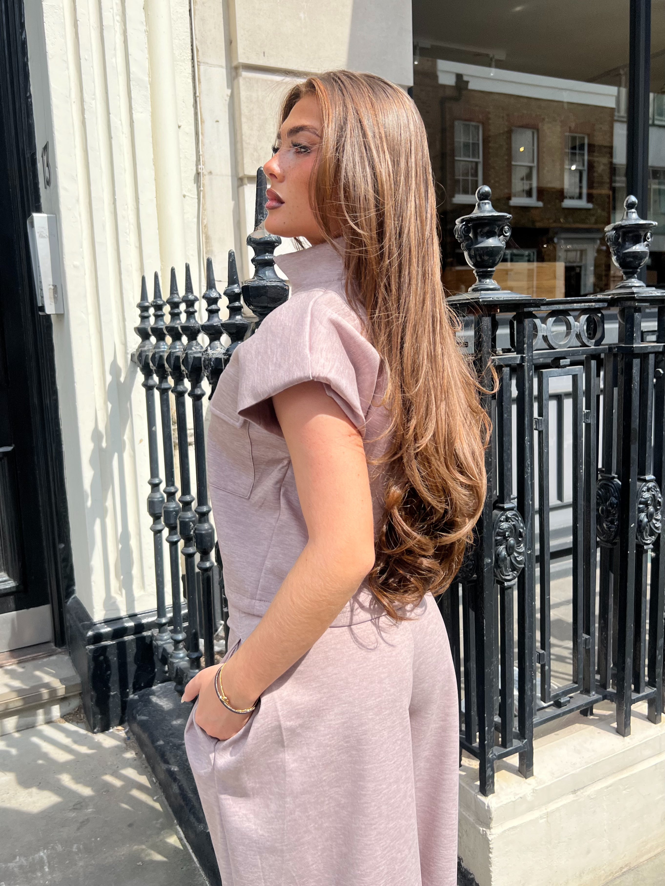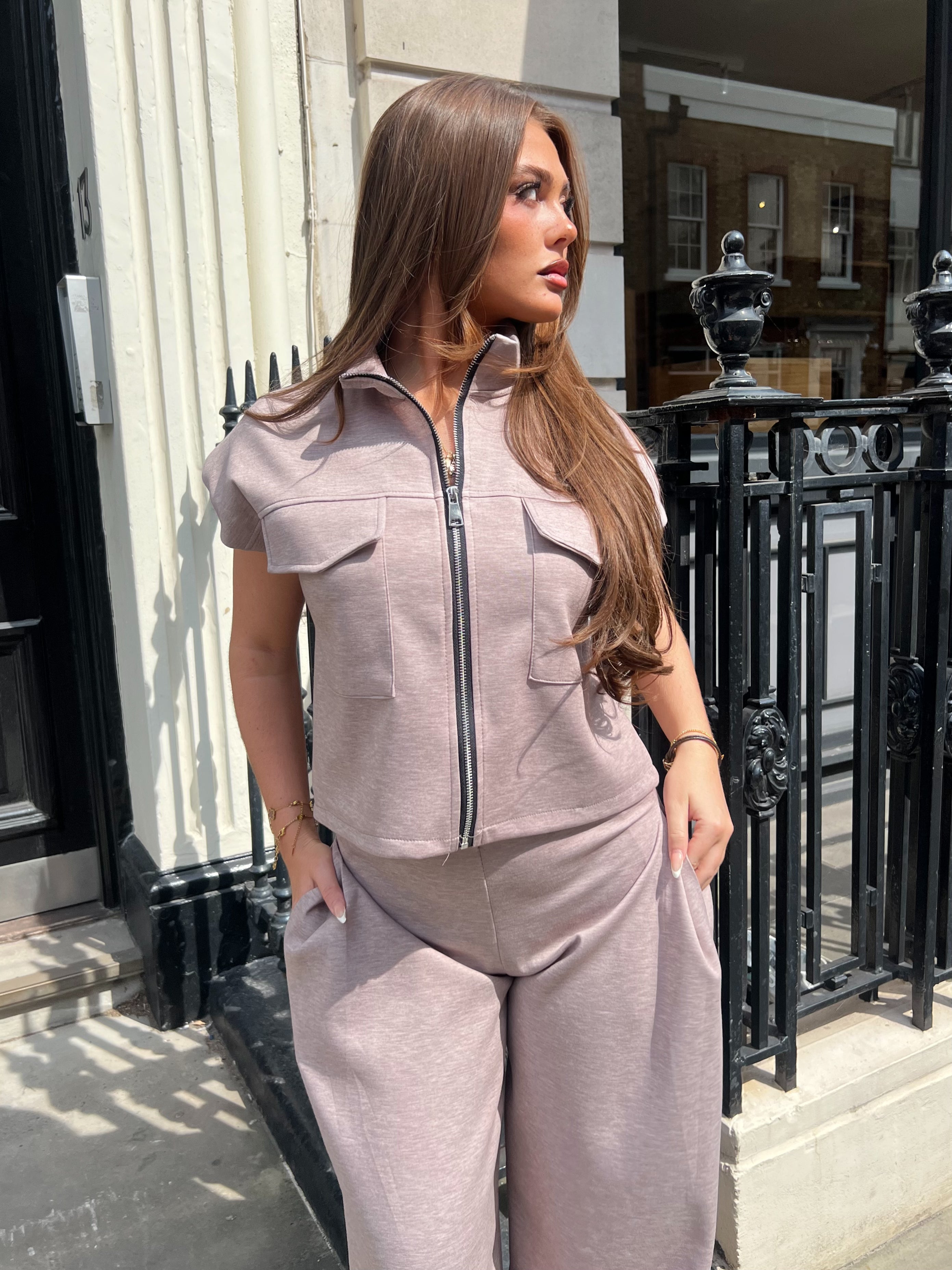 • Social Club Taupe Zip Short Sleeve Jacket & Wide Leg Trouser Co Ord