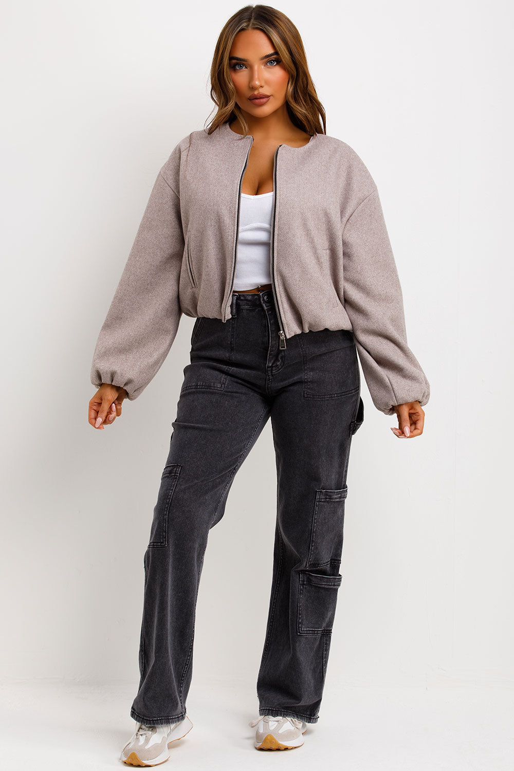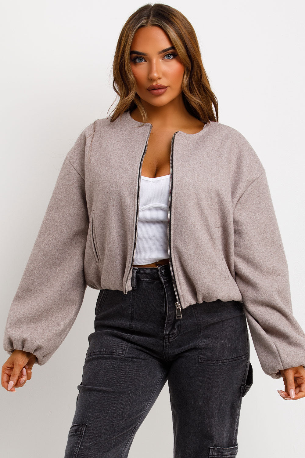 Soft bomber jacket. This bomber jacket is a must have for your new season outerwear wardrobe. Featuring soft bomber jacket with round neck elastic cuffs long sleeves pockets on front elasticated hem and zip up front. Style this bomber jacket with any outfit to complete the look we are loving. This soft bomber jacket is also available in other colours.