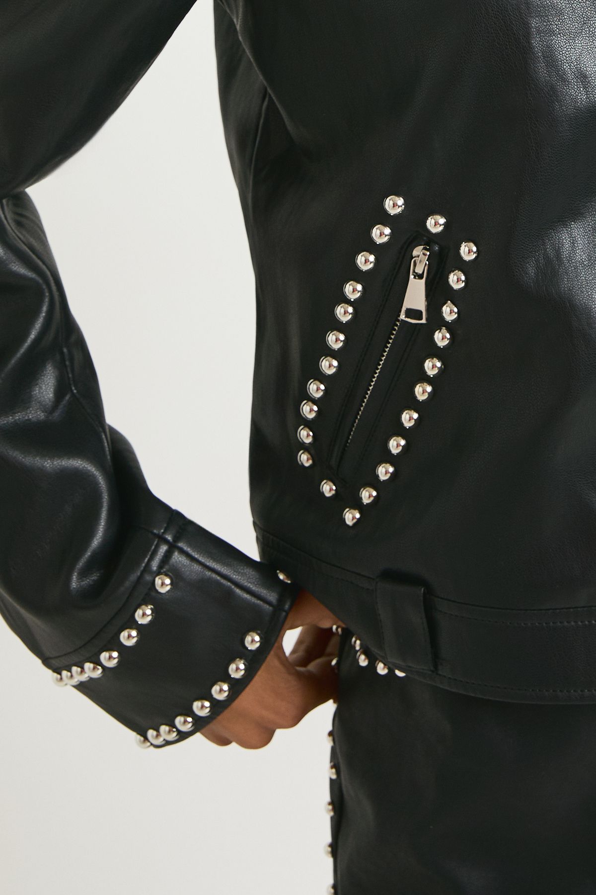 - Make a striking impression with this faux leather studded jacket that combines attitude with style. The eye-catching stud detailing along the collar, cuffs and pockets creates a distinctive rock-inspired aesthetic that demands attention. Style with a simple white crop top and matching faux leather trousers for a coordinated ensemble that's perfect for nights out with friends. For casual daytime wear, throw over a graphic tee with your favourite jeans and trainers. The versatile cropped silhouette works brilliantly with high-waisted bottoms, creating a flattering proportion that elongates your frame. This Boohoo statement piece transitions effortlessly from casual coffee dates to evening gatherings, making it an essential addition to your wardrobe for those moments when you want to showcase your bold fashion sense whilst maintaining comfort and practicality.