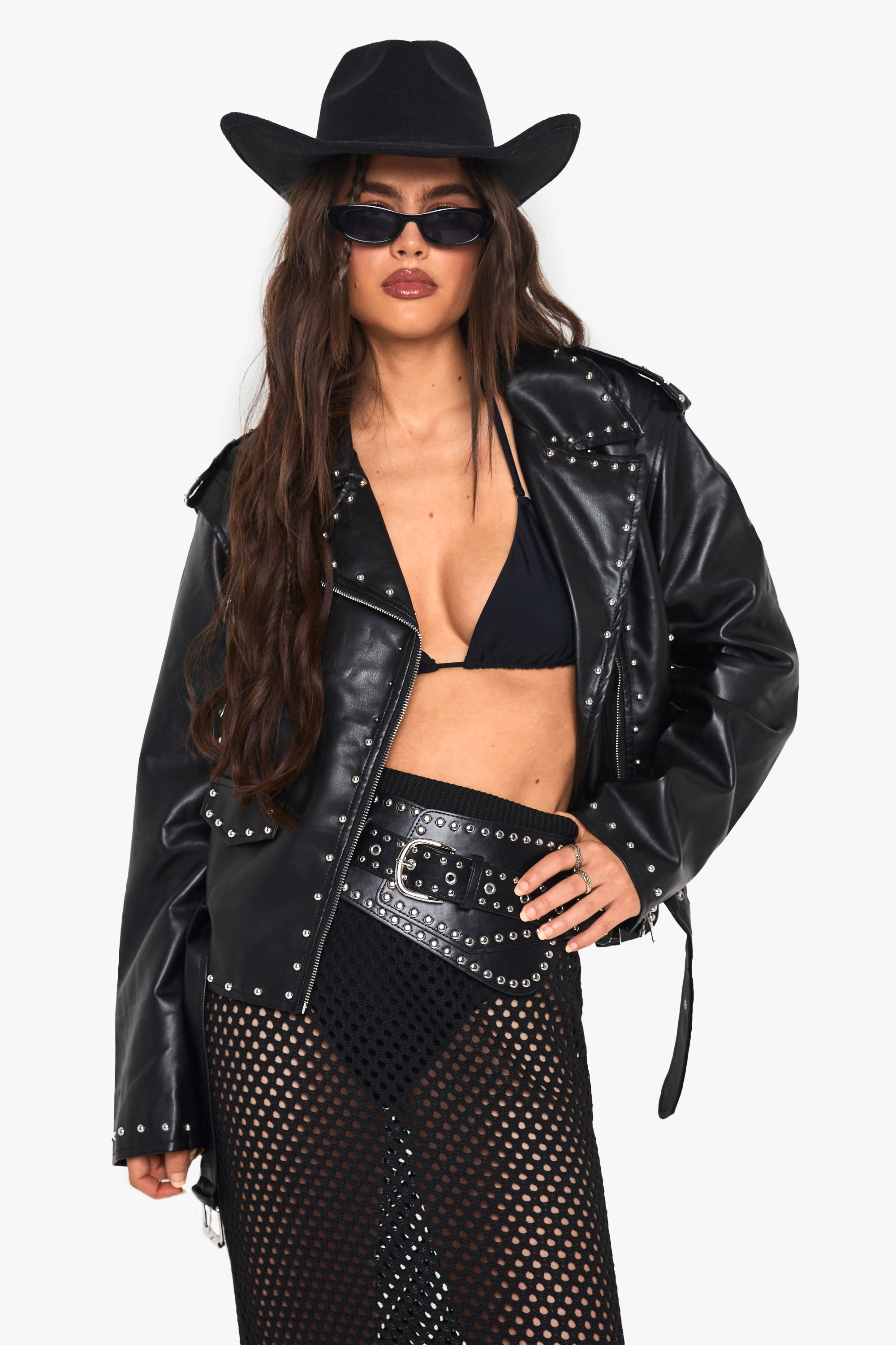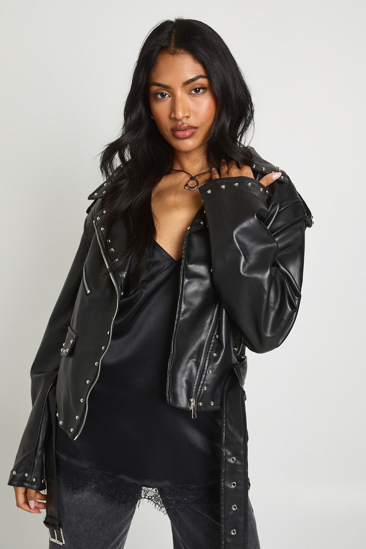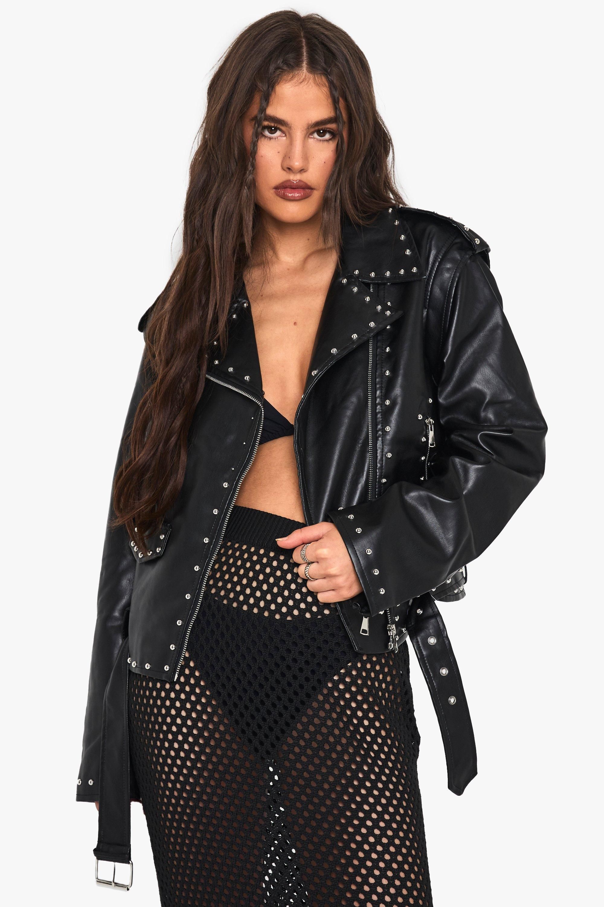 - Make a bold statement with this striking biker jacket from Boohoo. The studded detailing adds a rebellious edge, perfect for the fashion-forward woman who isn't afraid to stand out. Pair it with wide-leg trousers and a simple black top for a chic contrast, or throw it over a flowy dress to toughen up a feminine look. Ideal for casual outings or nights out with friends, this versatile piece can easily transition from day to evening wear. For a more relaxed ensemble, team it with your favourite jeans and trainers. The adjustable waist belt allows you to create a silhouette that flatters your figure, while the functional pockets offer practicality without compromising on style. This jacket is a must-have for those who want to inject some attitude into their wardrobe while maintaining a trendy, urban edge.