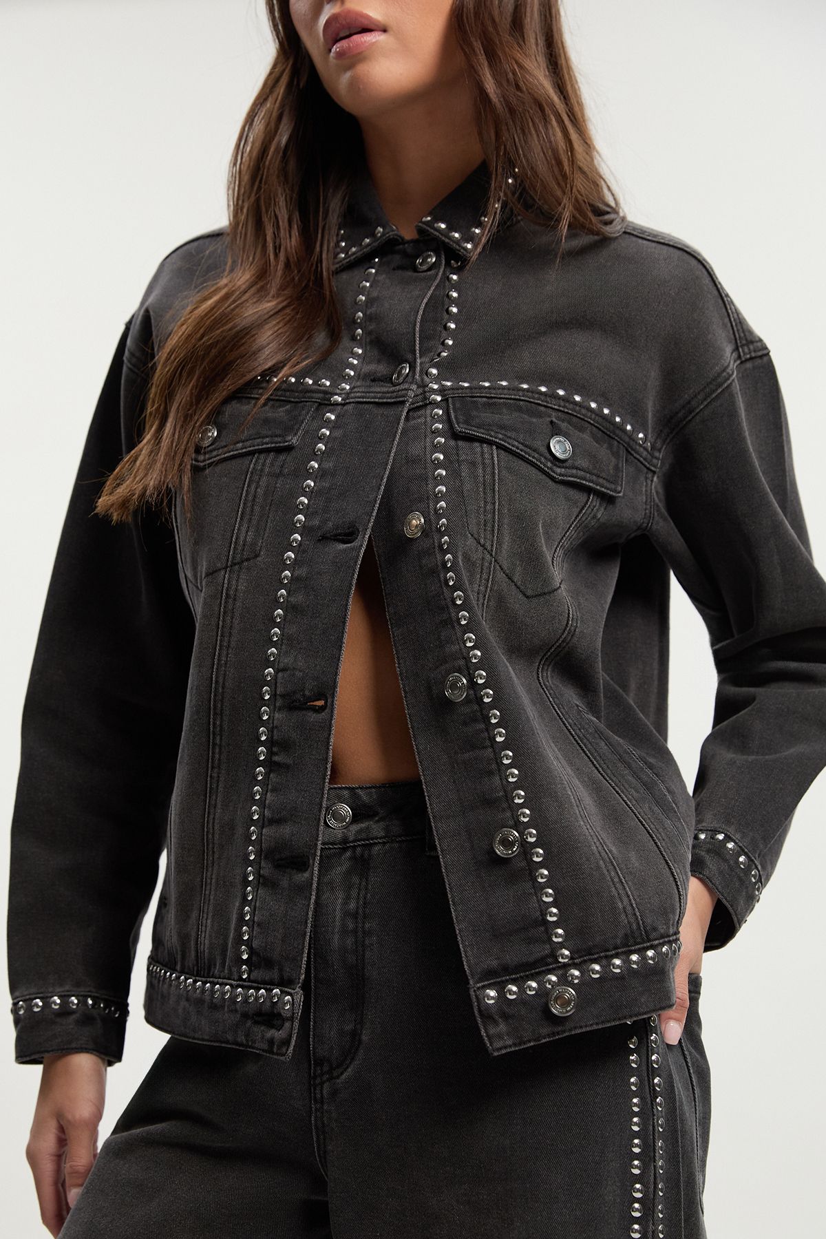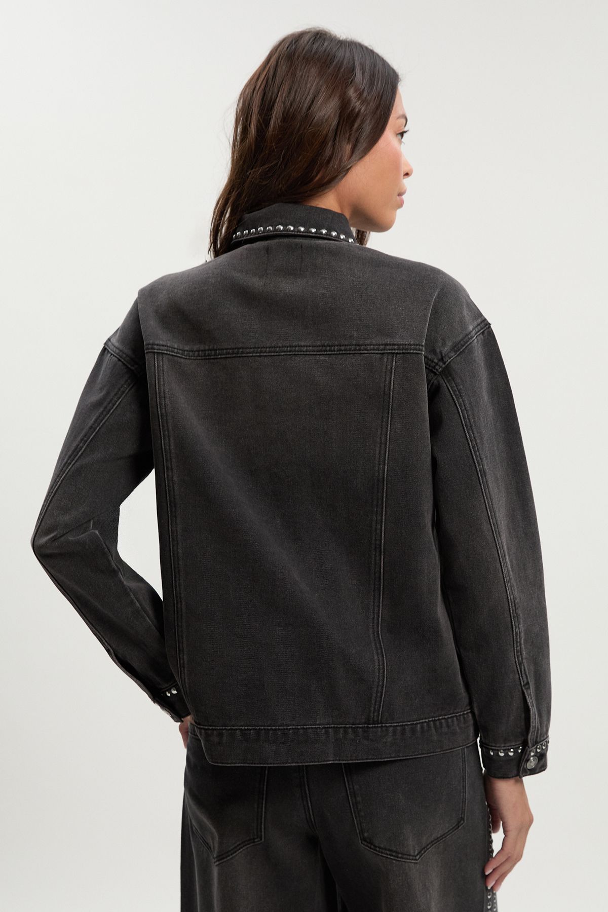 - Oversized fit denim jacket with eye-catching stud detailing along the edges and seams