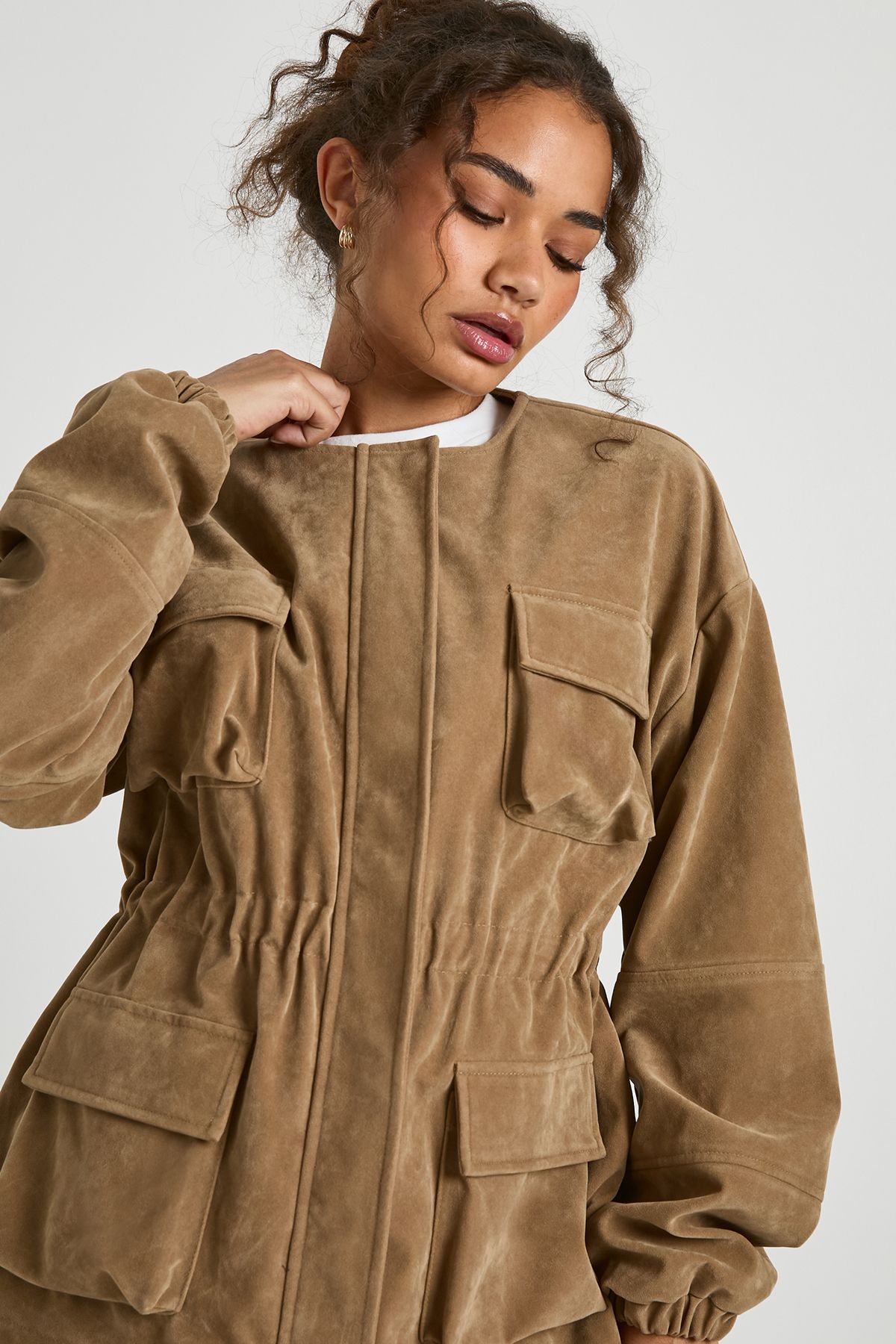 - Relaxed fit through the shoulders and sleeves for comfortable layering This collarless jacket combines casual comfort with effortless style. The cinched waist creates a defined silhouette that flatters your figure, while the faux suede texture adds a touch of sophistication to everyday outfits. Style with a simple white tee and matching mini skirt for a coordinated look, or pair with your favourite jeans and trainers for weekend coffee dates. The versatile design works brilliantly layered over knitwear when temperatures drop - try adding a patterned scarf for extra warmth and visual interest. Perfect for family gatherings or casual outings, this jacket offers the ideal balance between practical and fashionable. The utility-inspired pockets provide convenient storage while maintaining the jacket's relaxed aesthetic, making it a go-to piece for your autumn wardrobe.