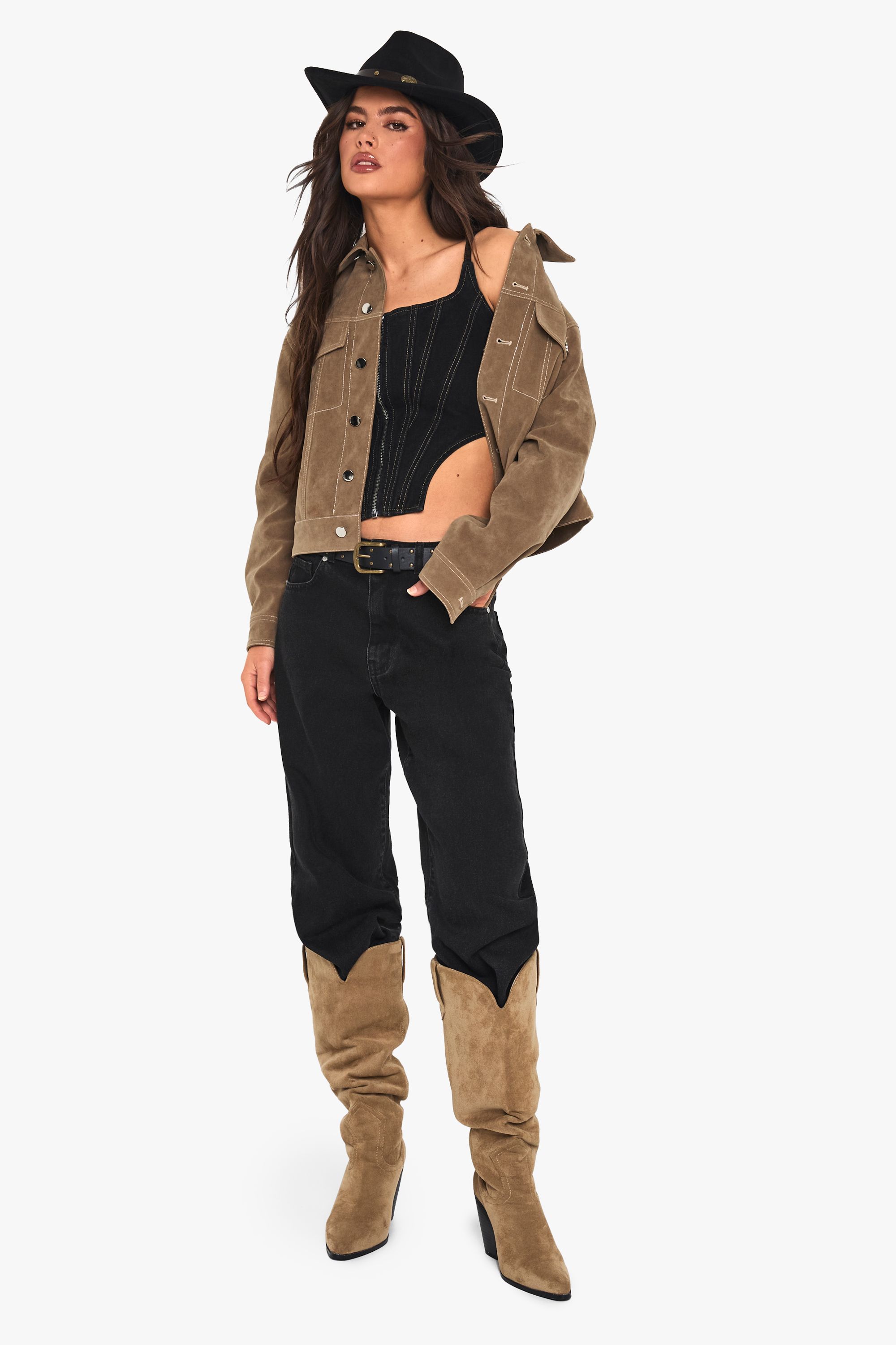 • Relaxed fit through the shoulders and arms for comfortable everyday wear This faux suede jacket with striking contrast stitching brings a touch of western-inspired flair to your casual wardrobe. The cropped, boxy shape creates a flattering silhouette that works brilliantly with high-waisted jeans or trousers. Style as seen with black denim and a simple top for an effortlessly cool daytime look, or throw over a printed midi dress with ankle boots for weekend brunches. For a festival-ready ensemble, pair with denim shorts and wellies. The versatile nature of this jacket makes it ideal for transitional weather - layer over a lightweight jumper when temperatures drop. Perfect for family gatherings, casual coffee dates or shopping trips with friends, this jacket combines practicality with on-trend styling that embodies the Boohoo spirit of accessible fashion that doesn't compromise on style.