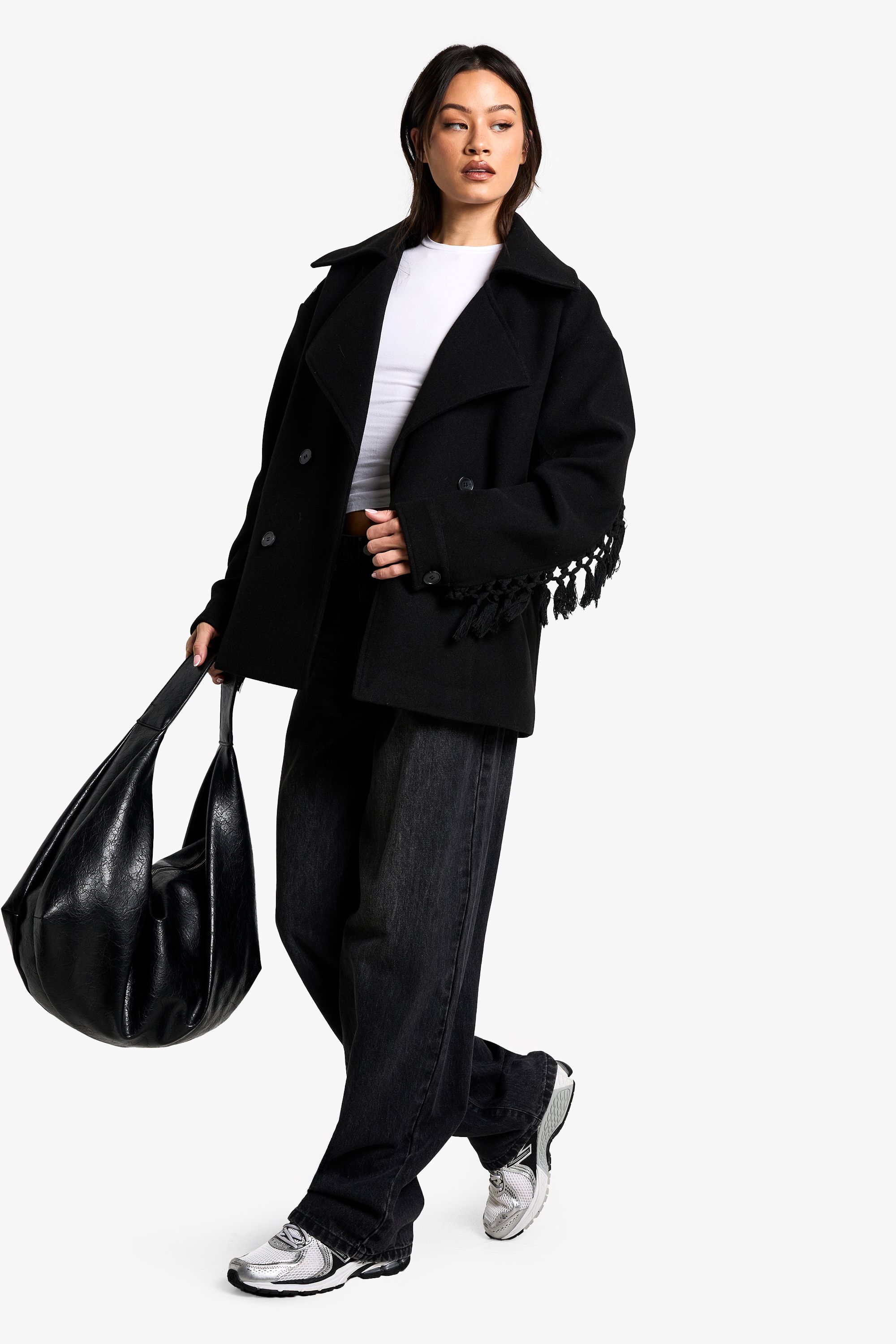 • Relaxed, oversized fit perfect for layering during cooler seasons This eye-catching jacket combines timeless design with contemporary flair through its striking tassel detail. The wool-look texture offers warmth without bulk, while the relaxed silhouette provides ample room for layering over jumpers or hoodies. Style with wide-leg trousers and trainers for an effortlessly cool daytime look, as seen on our model. For evening gatherings, pair with slim-fit jeans and ankle boots to create a balanced silhouette. The versatile design works brilliantly for casual weekend brunches or family gatherings, while the statement sleeve detail ensures you'll stand out from the crowd. The oversized proportions make this jacket ideal for the transitional months when layering is essential, and the classic double-breasted design ensures it will remain a wardrobe staple for seasons to come.