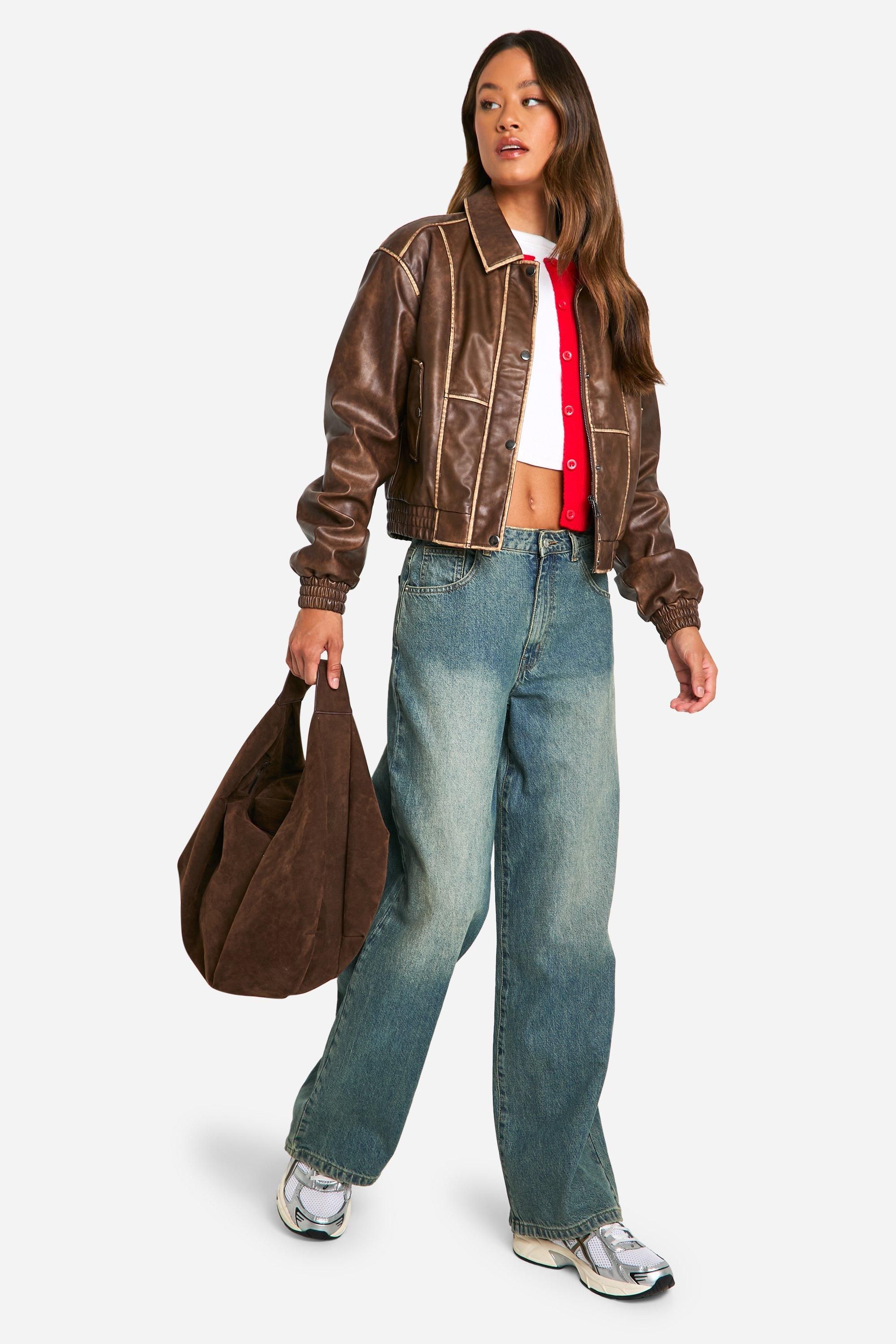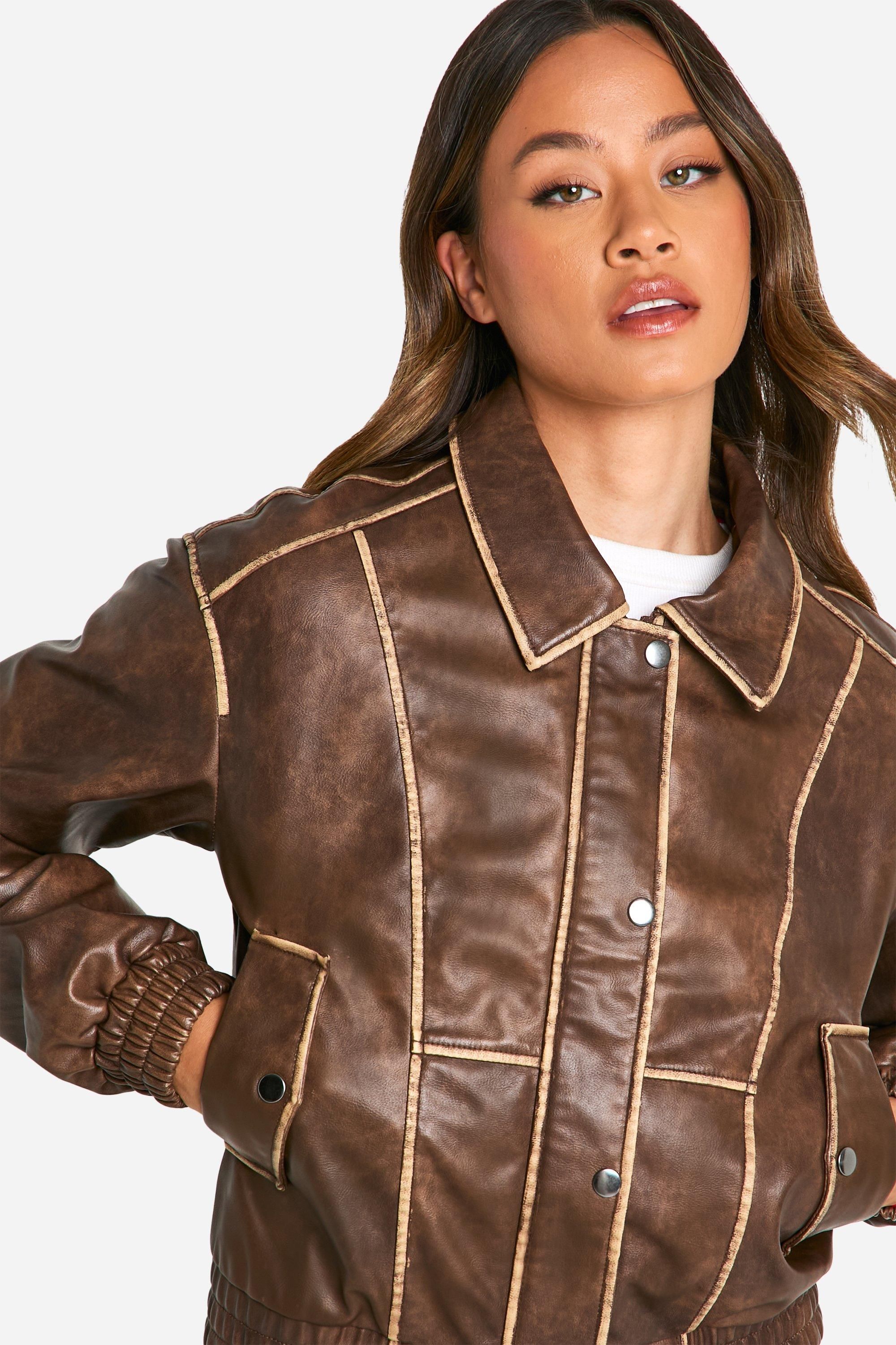 - Channel retro vibes with this striking faux leather jacket, perfect for the fashion-forward Boohoo girl. The vintage-inspired design is brought into the present with its cropped length and sleek silhouette. Style it with high-waisted jeans and a crop top for a casual day out, or throw it over a midi dress for an edgy evening look. The jacket's versatility shines through its ability to complement both relaxed and slightly dressier ensembles. For a laid-back weekend outfit, pair it with wide-leg trousers, trainers, and a simple tee. The contrasting piping adds a unique touch, ensuring you stand out at family gatherings or casual meet-ups with friends. This jacket is a must-have piece for those who want to infuse their wardrobe with a touch of nostalgia while staying on-trend.