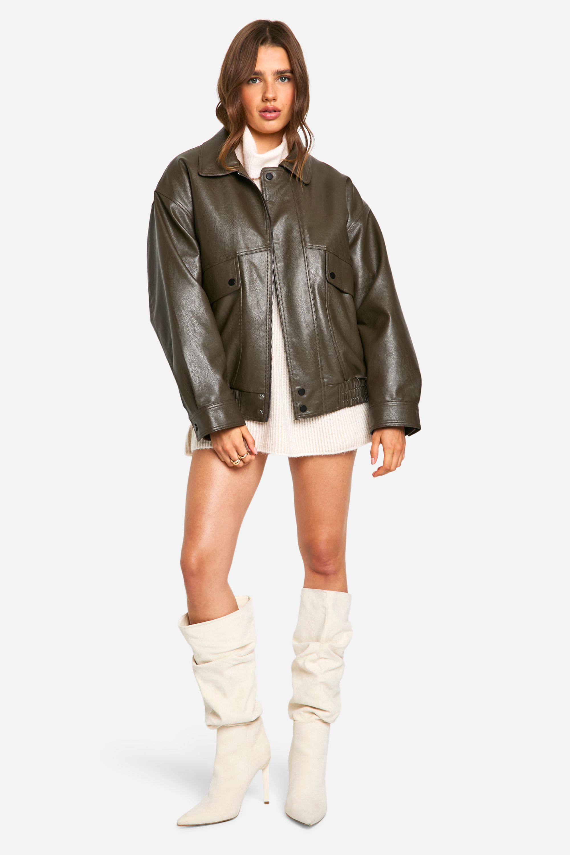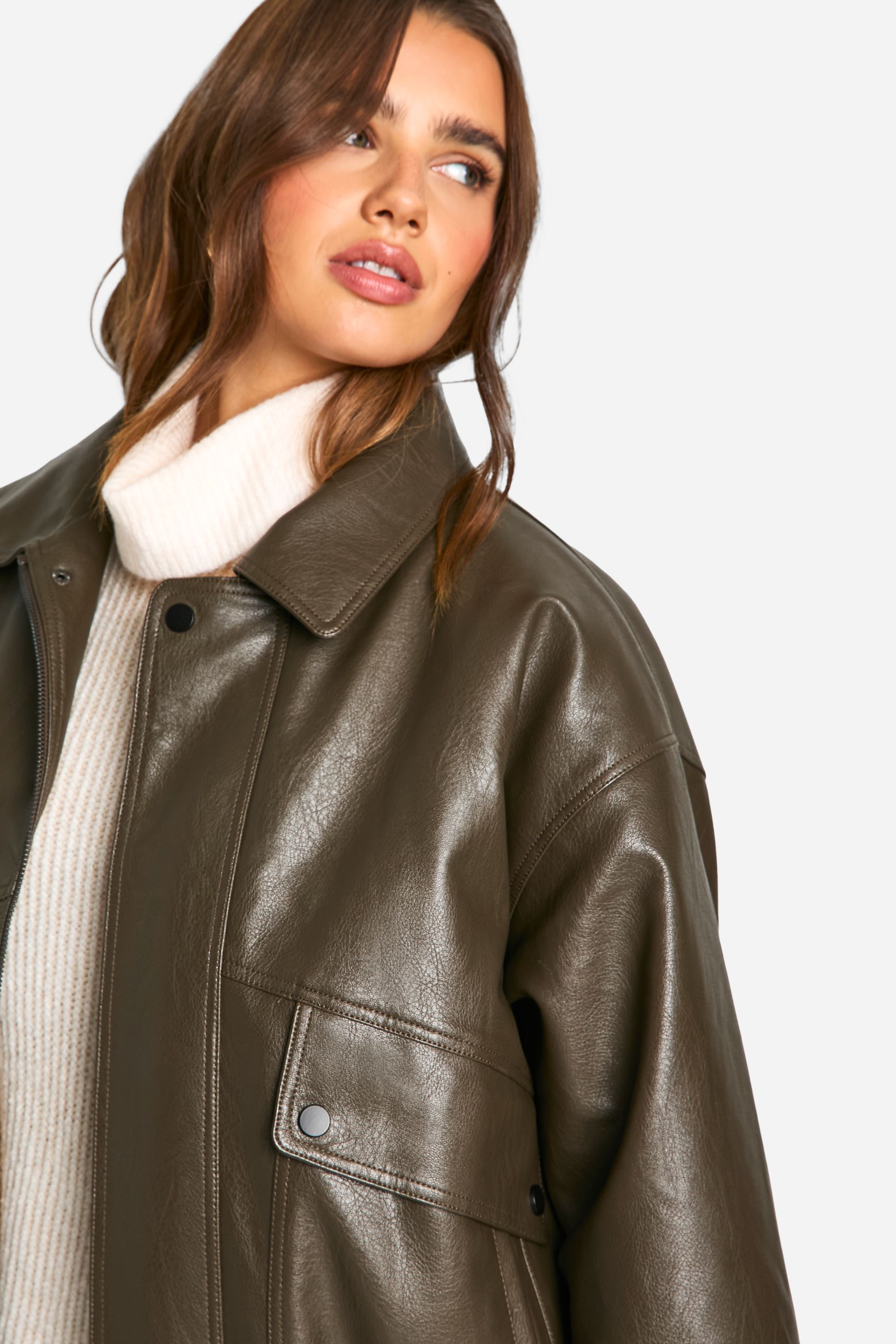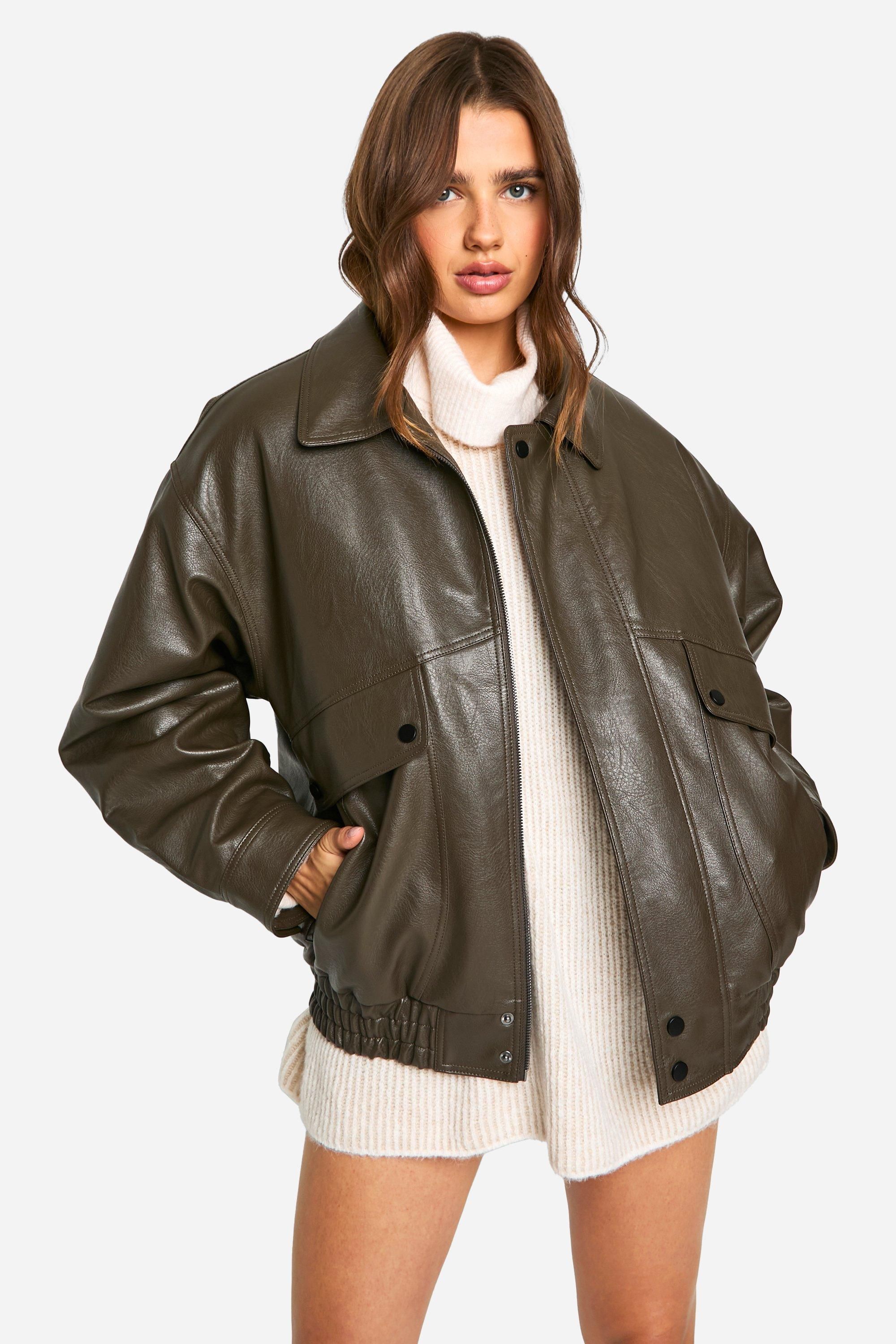 • Versatile piece suitable for various casual outfits Make a bold statement with this oversized faux leather bomber jacket from Boohoo. Perfect for the fashion-forward woman who loves to stay ahead of the trends, this jacket combines classic bomber styling with a contemporary oversized fit. The ribbed cuffs and hem provide a snug feel, while the roomy silhouette allows for effortless layering over your favourite jumpers or hoodies. Style it with a mini dress and knee-high boots for a chic contrast, or keep it casual with joggers and trainers for an off-duty look. This versatile piece is ideal for casual outings, from coffee dates to shopping trips, and can easily transition from day to night. The faux leather finish adds a touch of edge to any ensemble, making it a must-have addition to your wardrobe for those who want to inject some attitude into their everyday style.