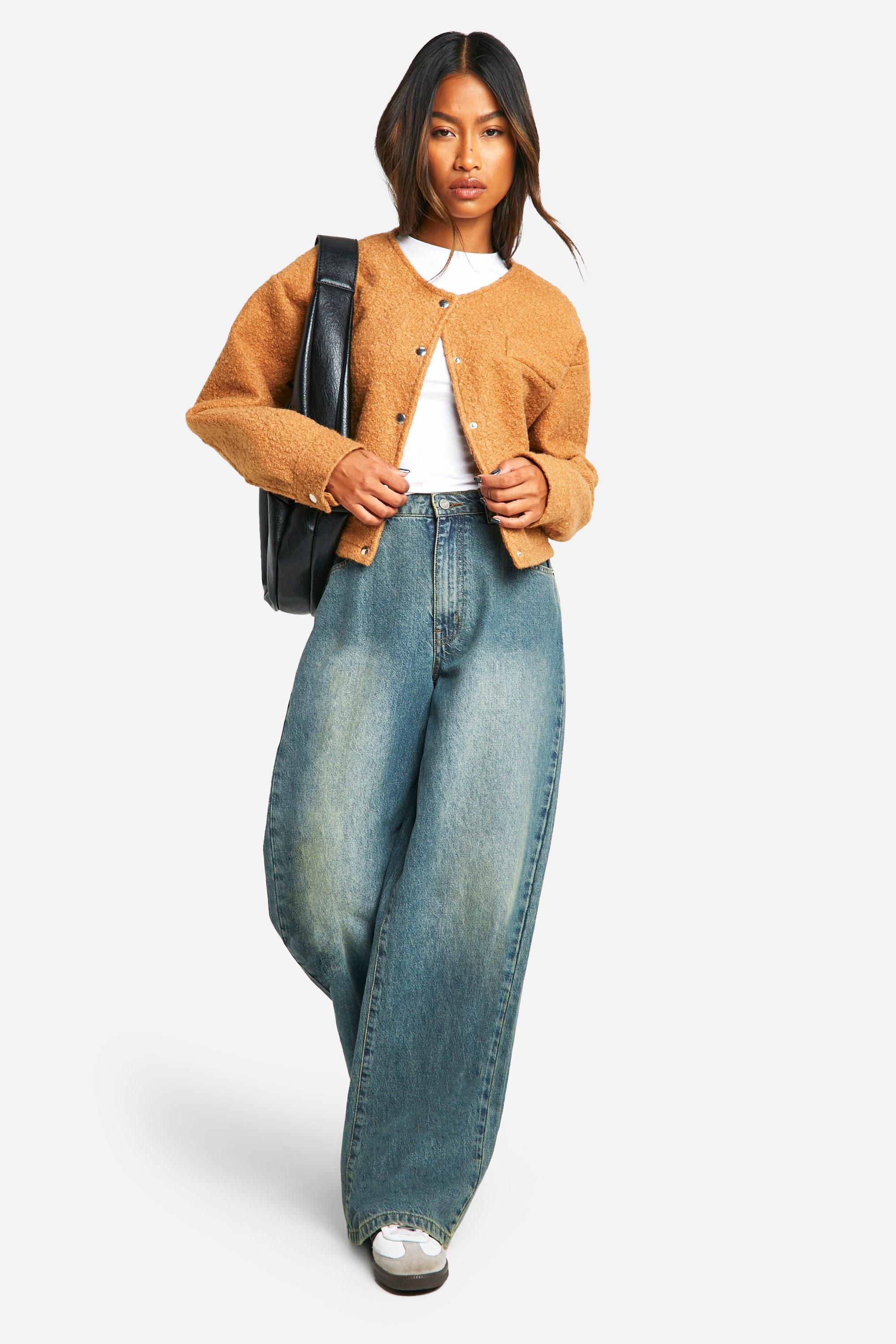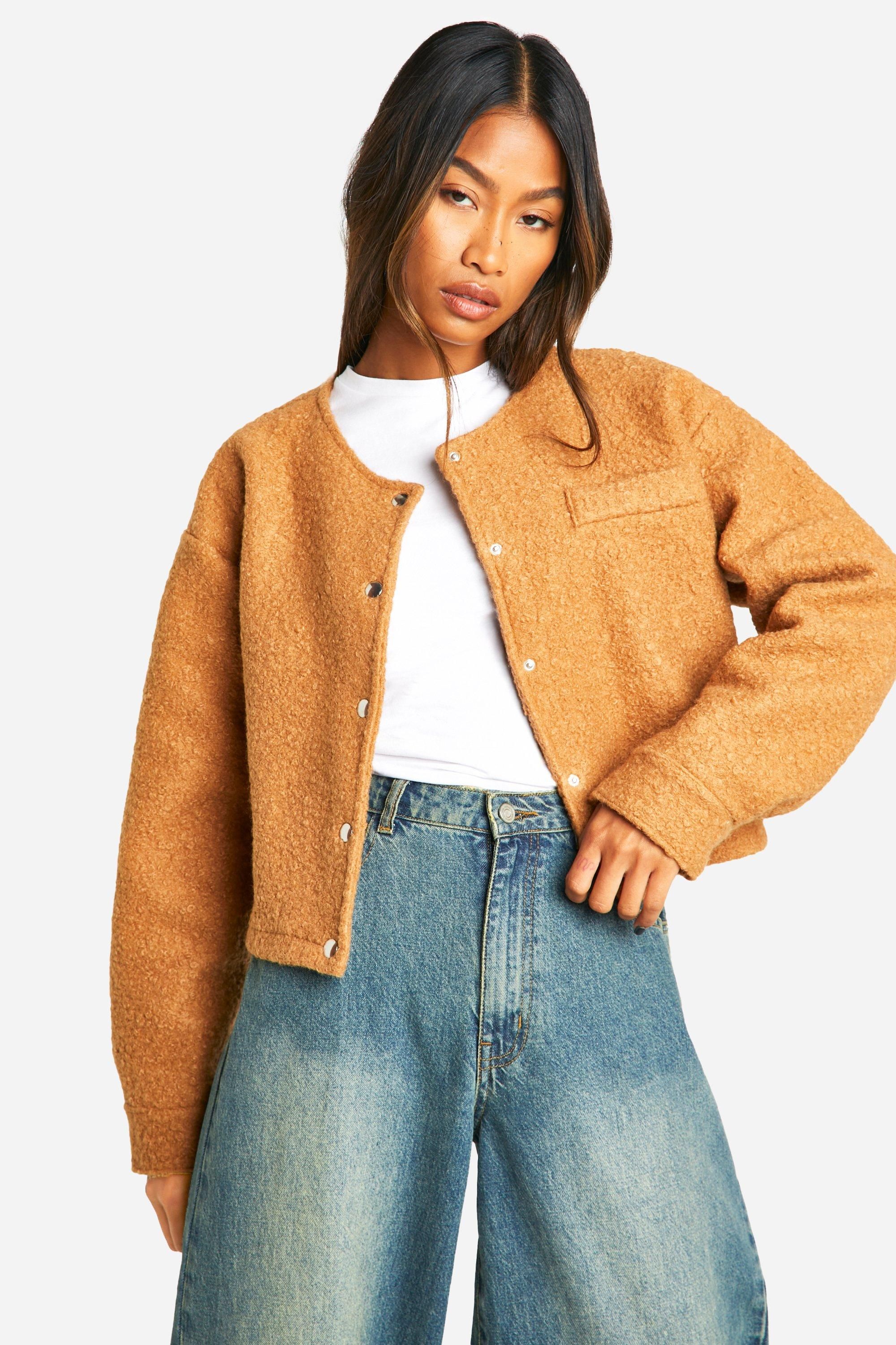 • Keep things casual but always on-trend with a piece of outerwear perfection, the bomber jacket. A light jacket featuring a gathered, ribbed waistband and matching cuffs, a bomber jacket is versatile, timeless, and the perfect way to edge up your casual wear. Wear your new women's bomber jacket with a shirt and stripe joggers for the hottest look of the moment: sports luxe, or layer a varsity jacket over a t shirt dress for a fresh new-season look.Style: Wool Look JacketFabric: Wool LookLength: CroppedSleeve Length: Long Sleeve