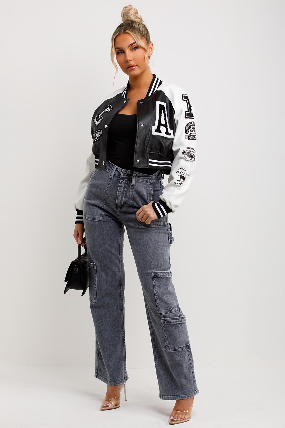 Varsity bomber jacket faux leather jacket. This faux leather bomber jacket is going your new season wardrobe to the next level effortlessly. Featuring faux leather short bomber jacket varsity style letter detail contrast sleeves and button fastening. Style this varsity bomber jacket with any outfit to complete the look. This faux leather bomber jacket is also available in other colours.