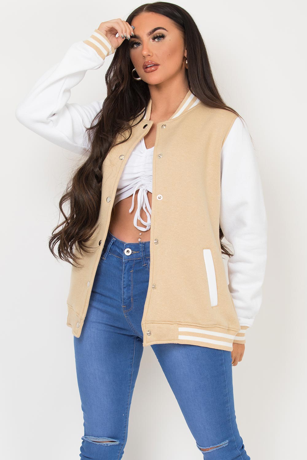 Varsity bomber baseball jacket. This bomber jacket is sure to elevate your casual game. Featuring varsity design contrast sleeves button fastening and pockets. Wear it with our high waisted jeans to complete the look. Also available in other colours.
