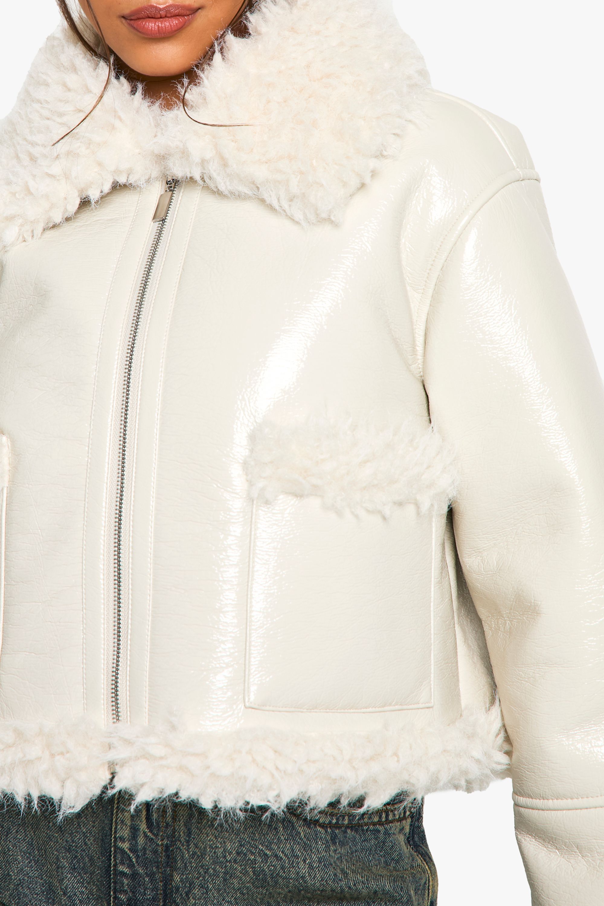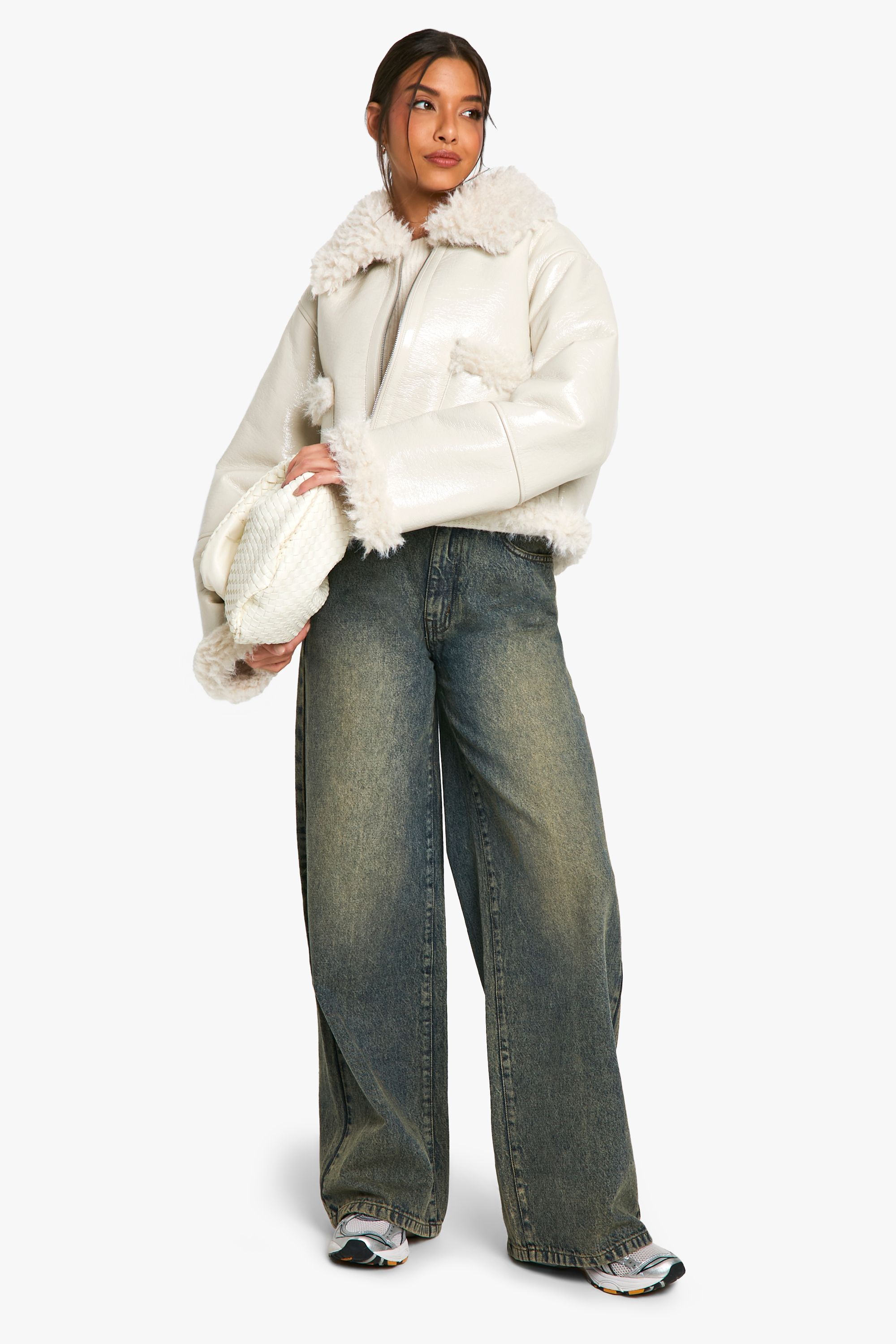• Versatile design suitable for various casual occasions Make a statement in this eye-catching vinyl jacket with faux fur detailing. The contrasting textures create a visually intriguing piece that's sure to turn heads. Its cropped silhouette is ideal for pairing with high-waisted trousers or skirts, creating a balanced and flattering look. For a casual day out, style it with wide-leg jeans and trainers, as seen on our model. When the temperature drops, layer it over a chunky knit jumper for added warmth without compromising on style. This jacket is a versatile addition to your wardrobe, perfect for family gatherings, brunches with friends, or even a night out at your local pub. Its unique design allows you to effortlessly transition from day to night, making it a go-to piece for the fashion-forward woman who values both style and practicality.