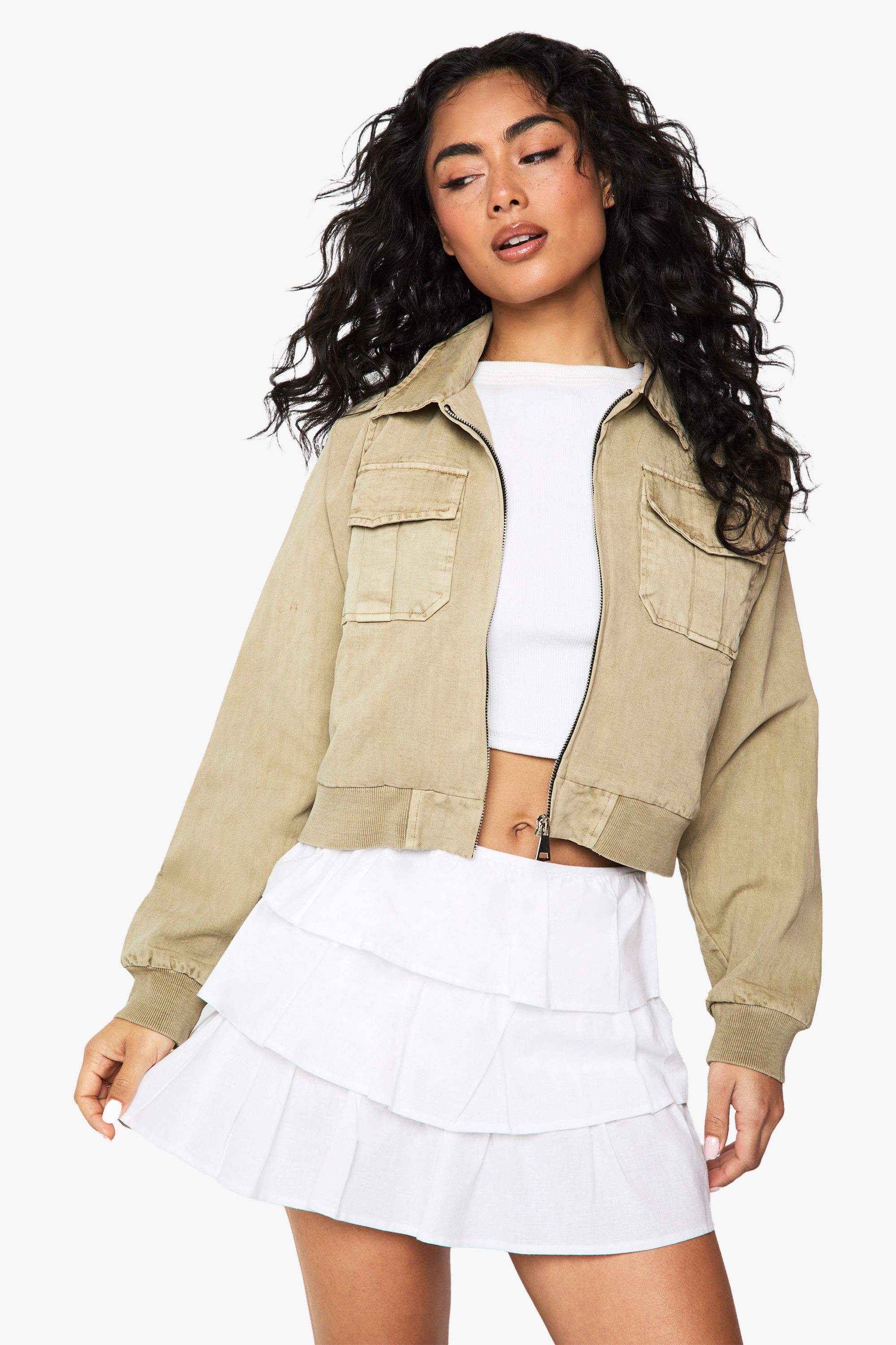 - This washed collared cropped jacket from Boohoo delivers the perfect blend of casual cool and practical style. The versatile design works brilliantly with a simple white tee and tiered mini skirt for daytime outings, or pair with a bodysuit and high-waisted jeans for evening drinks with friends. The cropped length creates a flattering silhouette that highlights your waistline, while the utilitarian pocket details add an on-trend workwear influence. For cooler days, layer over a lightweight jumper and team with straight-leg trousers and trainers for a contemporary casual look. This jacket transitions seamlessly from family gatherings to weekend brunches, making it an essential addition to your everyday wardrobe. Complete the look with minimal accessories and a small shoulder bag for an effortlessly chic finish.