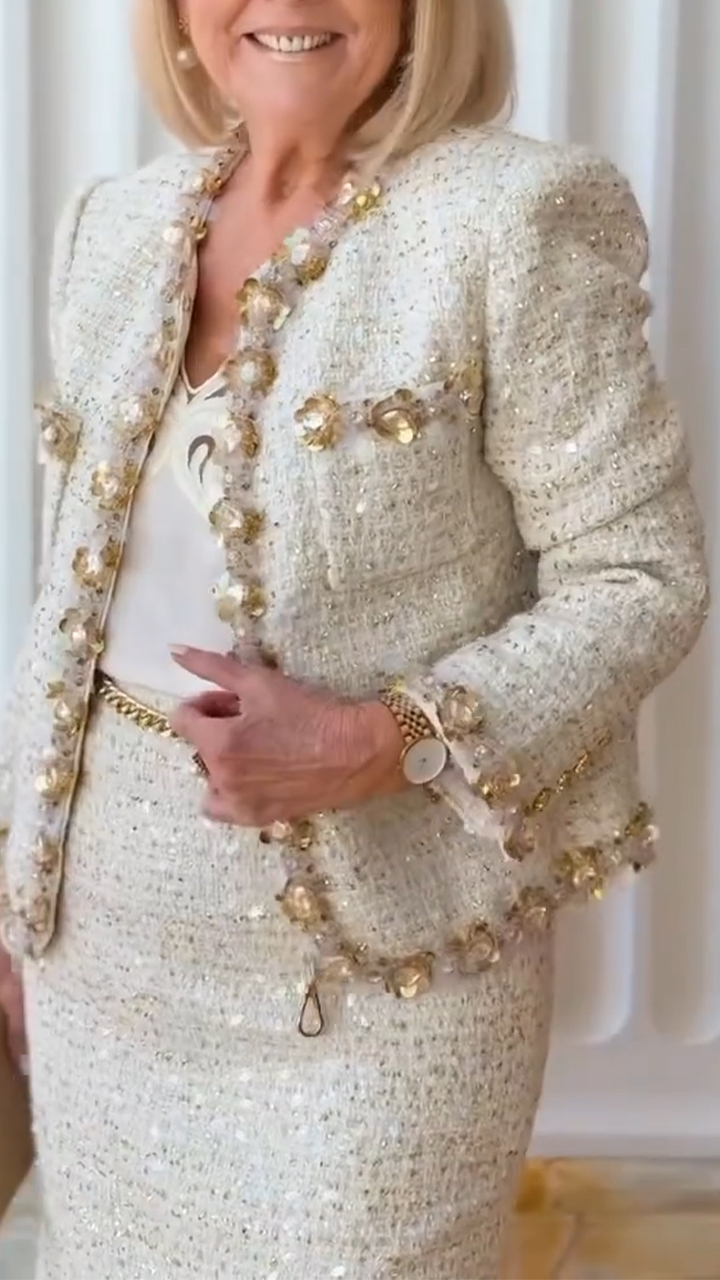 • Women Round Neck 3D Flower Jacket + Spliced ​​mesh Skirt Elegant Temperament Casual Suit