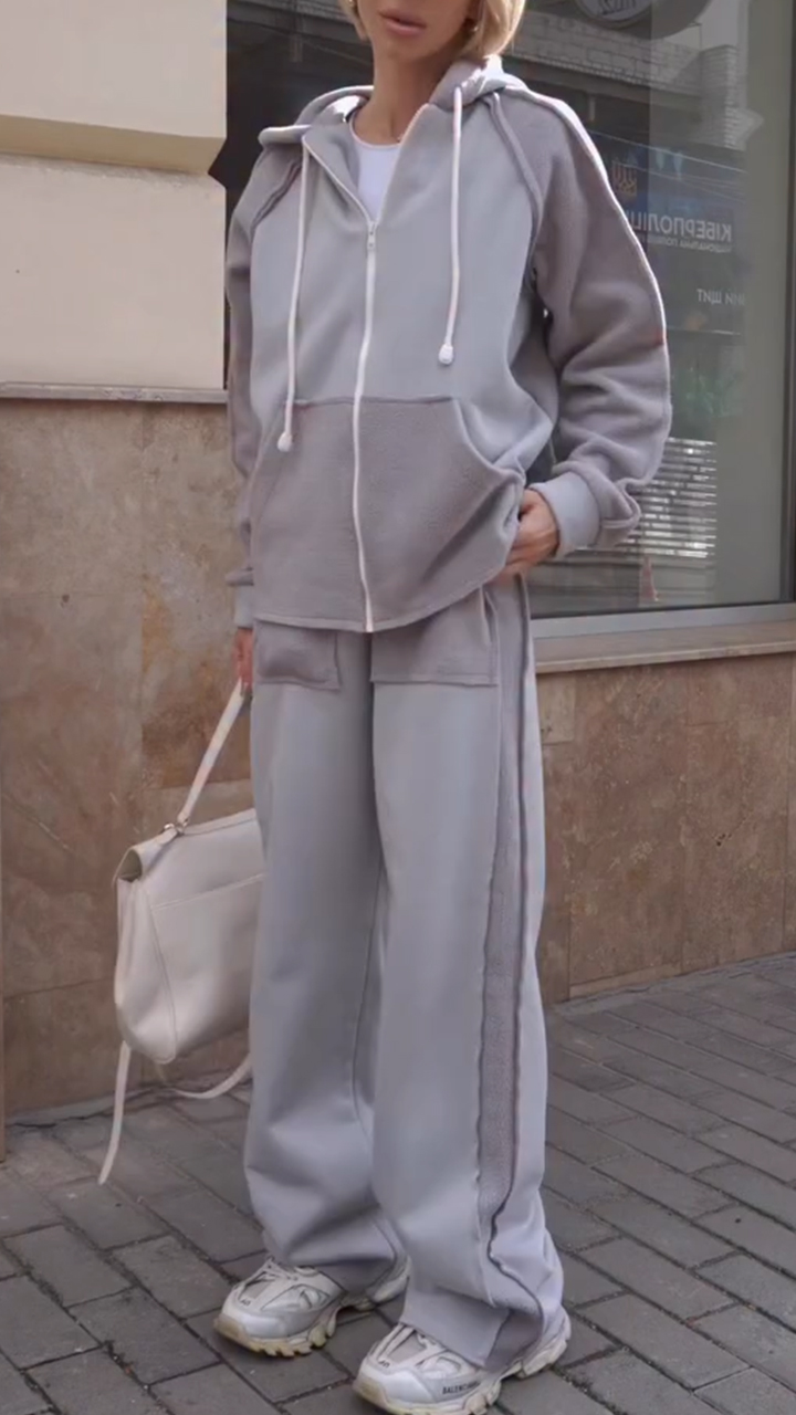 • Women Round Neck Hooded Jacket + Pants Splicing Casual Suit