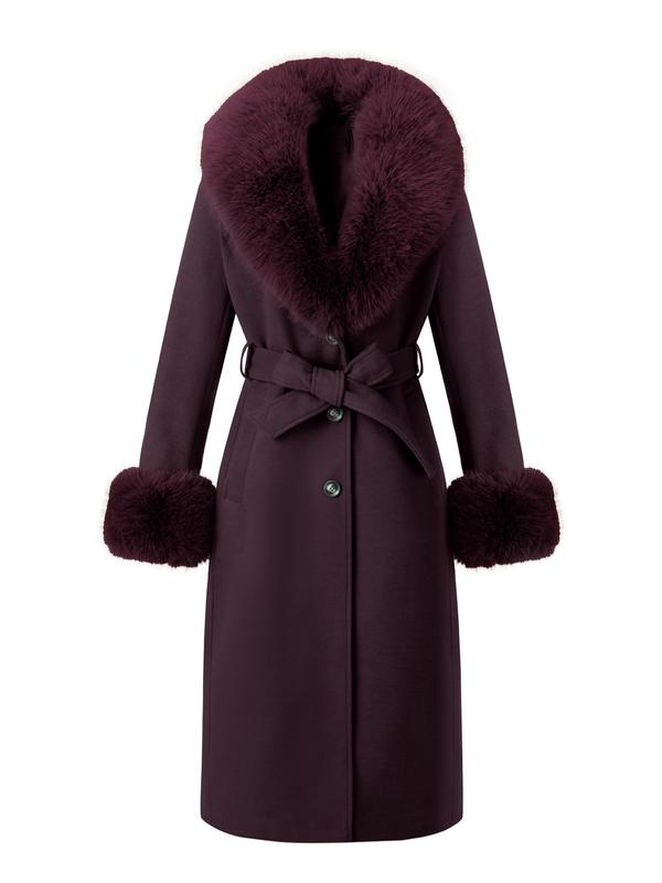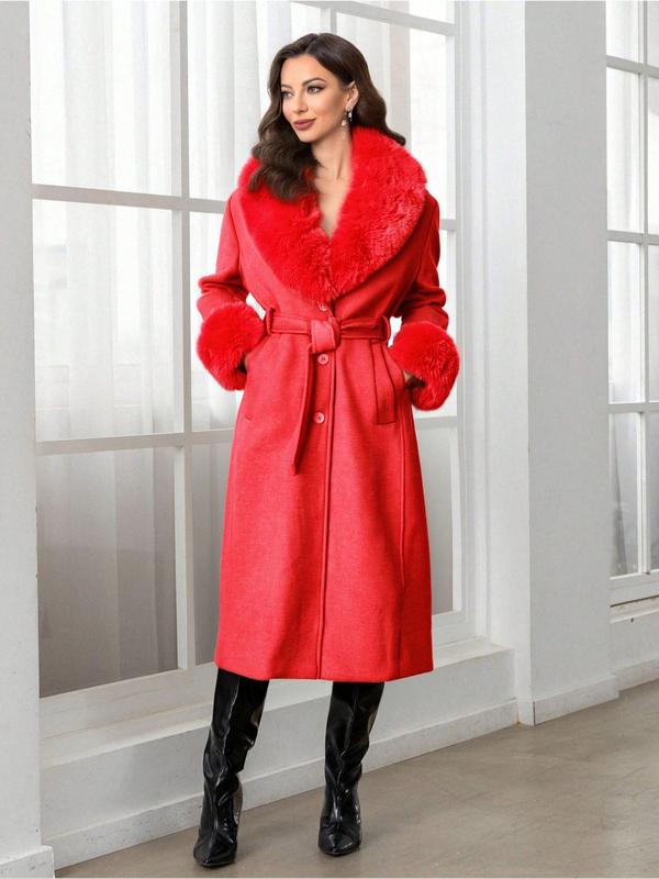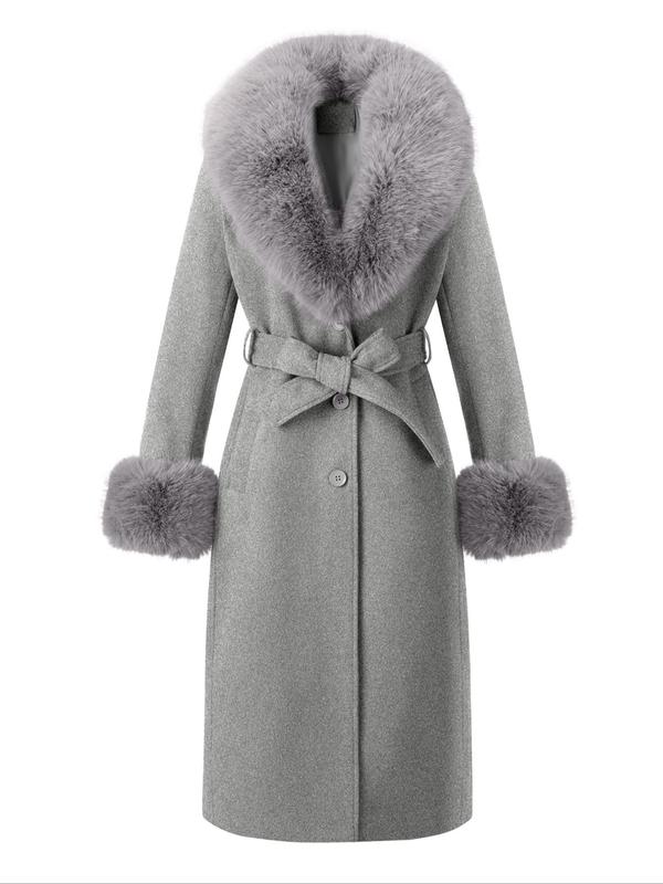 • Women's Fall Winter Mid-Length Plain Woolen Coat, Warm Fitted Jacket with Fur Collar, Waist Belt & Pockets, Casual Style