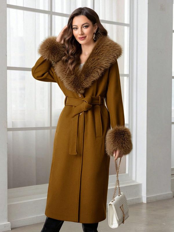 Women's Fall Winter Mid-Length Plain Woolen Coat, Warm Fitted Jacket with Fur Collar, Waist Belt & Pockets, Casual Style