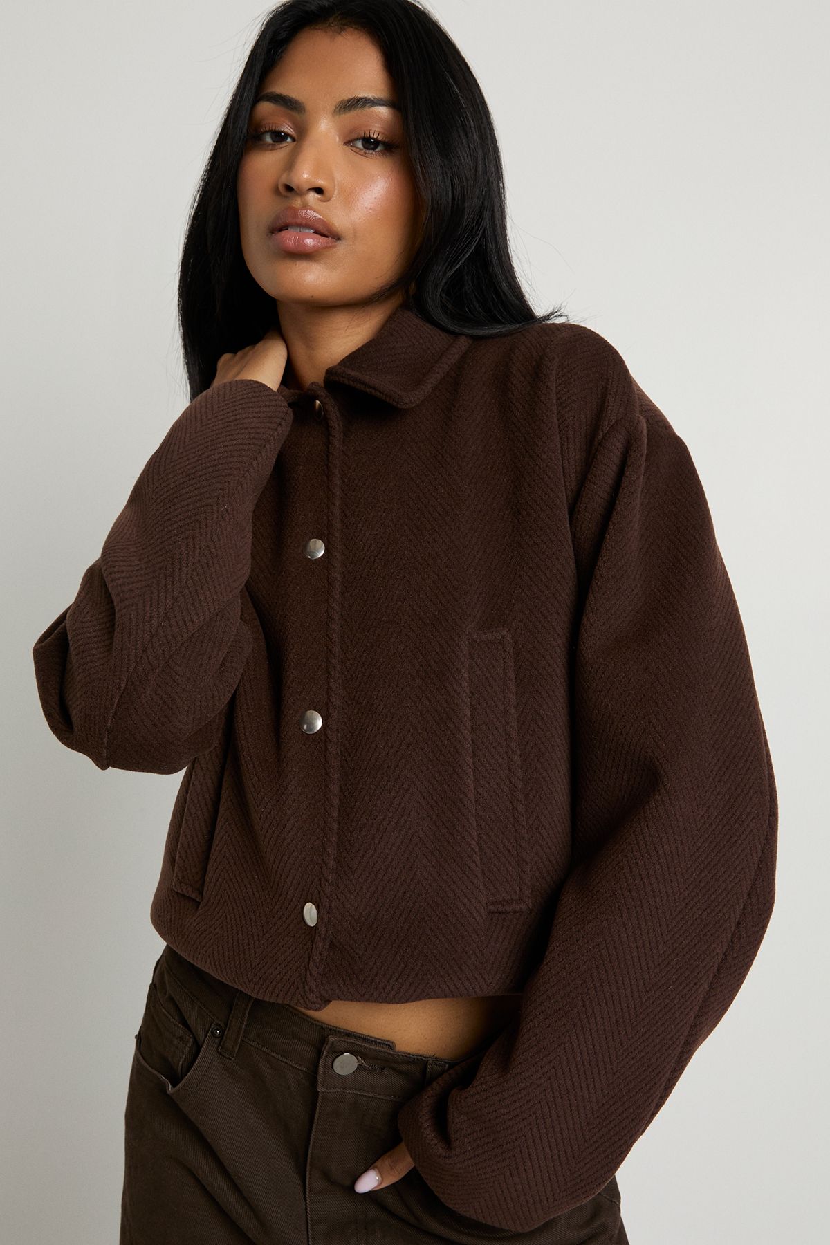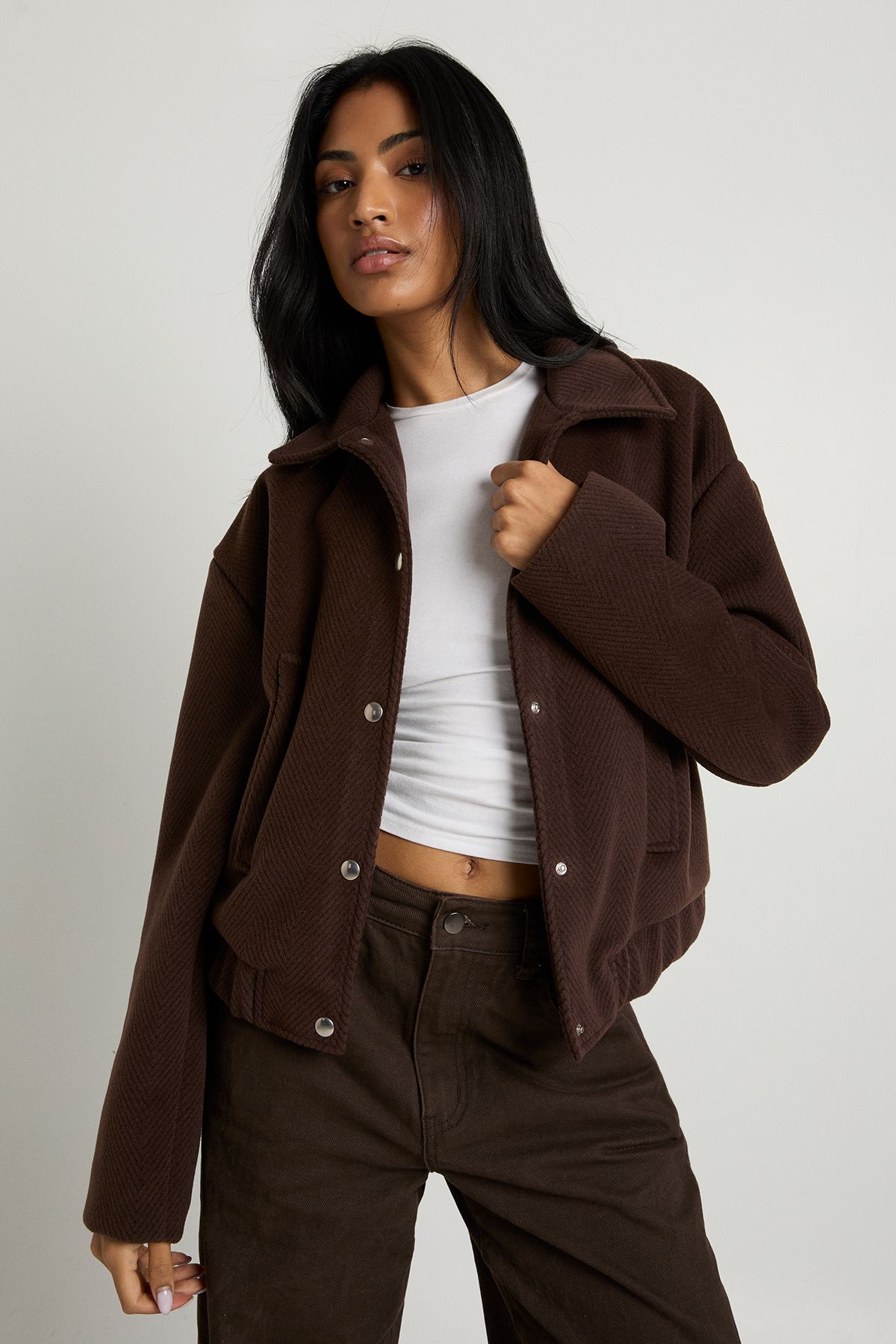 • This Boohoo Wool Look Collar Bomber Jacket reimagines a casual classic with modern proportions. The oversized silhouette creates a relaxed, on-trend aesthetic that works brilliantly with both fitted and loose-fitting pieces underneath. Style as seen with a simple crop top and wide-leg trousers for a balanced silhouette that's perfect for coffee dates or weekend shopping trips. For cooler days, layer over a thin rollneck jumper with straight-leg jeans and trainers. The jacket's versatile design makes it an ideal throw-on piece for family gatherings or casual meet-ups with friends. Its structured collar adds a refined touch to an otherwise casual piece, allowing you to transition seamlessly from day to evening occasions. Pair with a shoulder bag and minimal jewellery to complete this effortlessly cool look that captures the essence of contemporary British street style.