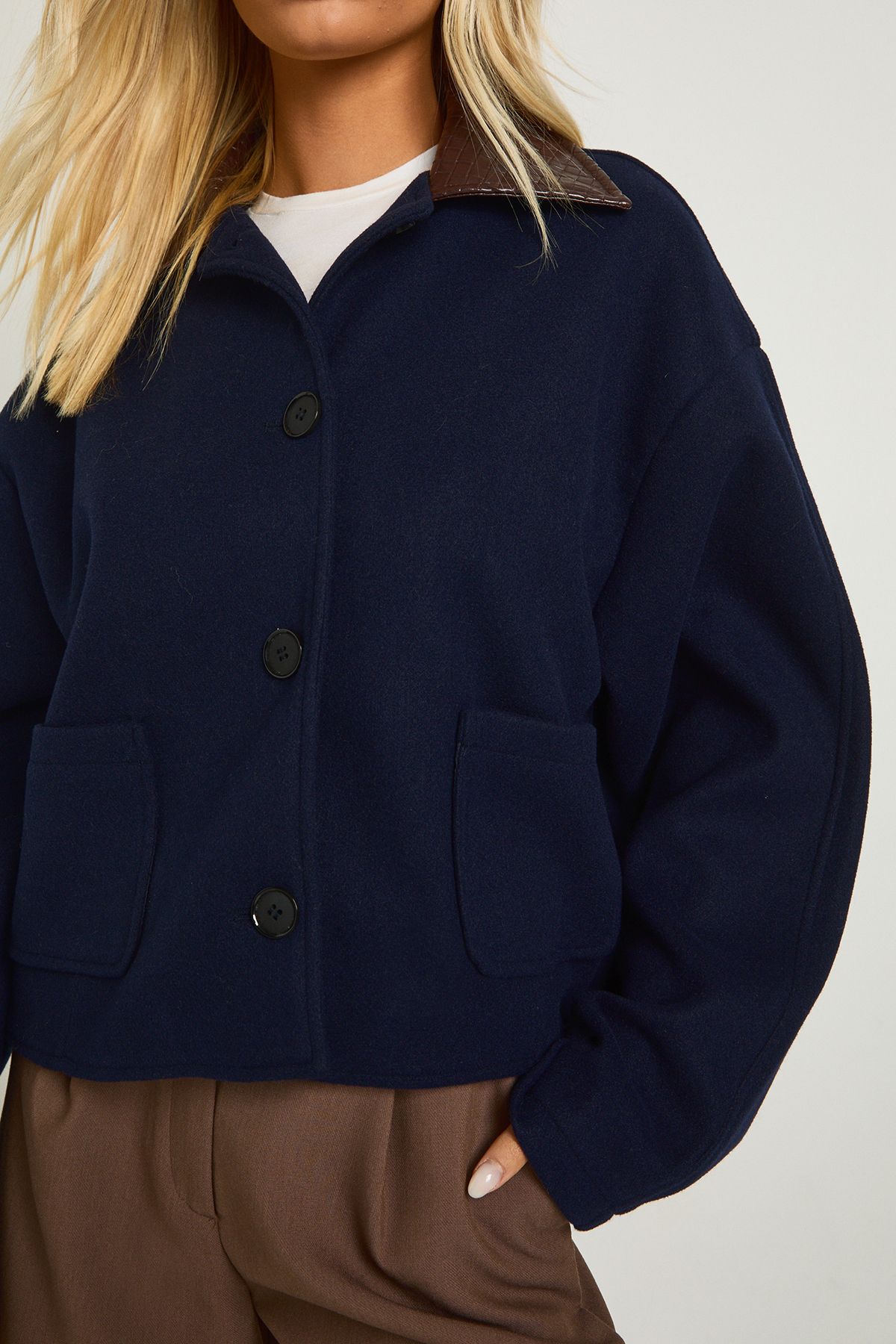 - This cropped jacket combines casual charm with distinctive design elements, making it a standout addition to your autumn wardrobe. The contrast faux leather collar adds a touch of sophistication to the wool-look texture, creating a piece that transitions effortlessly from day to night. Style as seen with tailored shorts and knee-high boots for a fashion-forward daytime look, or pair with your favourite jeans and trainers for weekend coffee runs. The relaxed silhouette works beautifully layered over everything from simple tees to lightweight jumpers, while the practical pockets add functionality to your everyday ensemble. Perfect for family gatherings or casual outings when the temperature drops, this Boohoo jacket delivers on both style and comfort for the fashion-conscious woman.