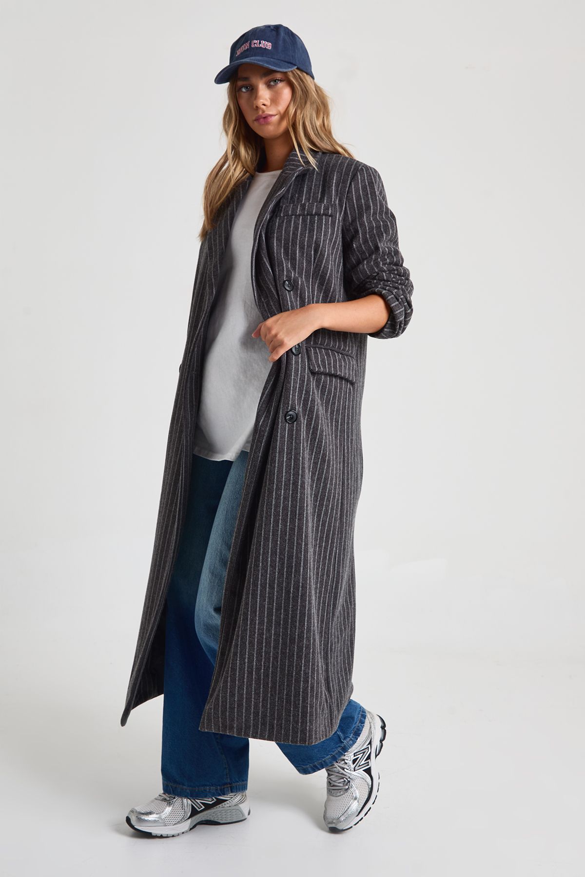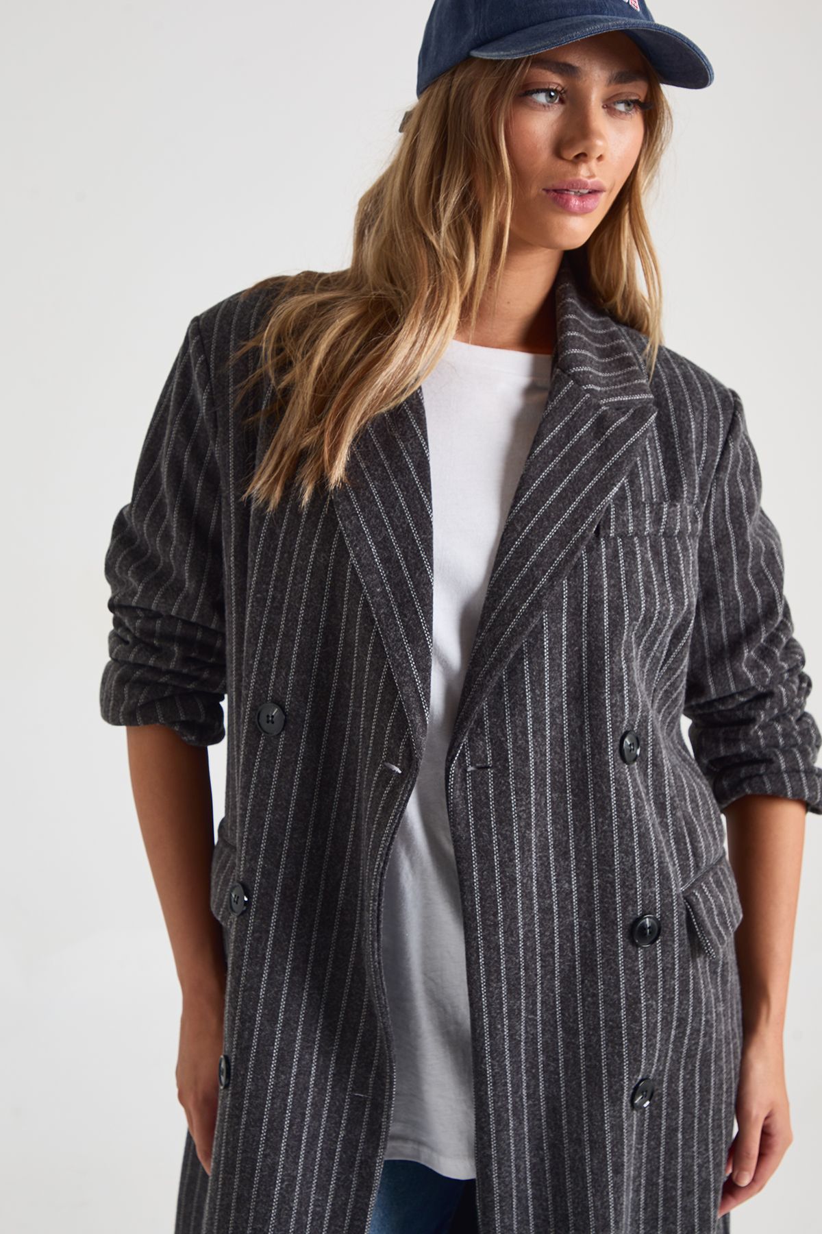 - Make a bold statement with this wool-look pinstripe maxi jacket that effortlessly bridges the gap between casual comfort and structured style. The oversized fit creates a relaxed silhouette that's perfect for layering over your favourite basics. As seen on our model, pair with a simple white tee and wide-leg jeans for an effortlessly cool weekend look, complete with trainers for urban exploration. The versatile design works brilliantly for family gatherings or casual coffee dates, whilst the structured shoulders and classic pinstripe pattern add a touch of refinement to your everyday wardrobe. The maxi length offers extra warmth during cooler months without compromising on style. This Boohoo statement piece can be customised to suit your mood - wear open over a casual ensemble or buttoned up as a statement coat when the temperature drops.