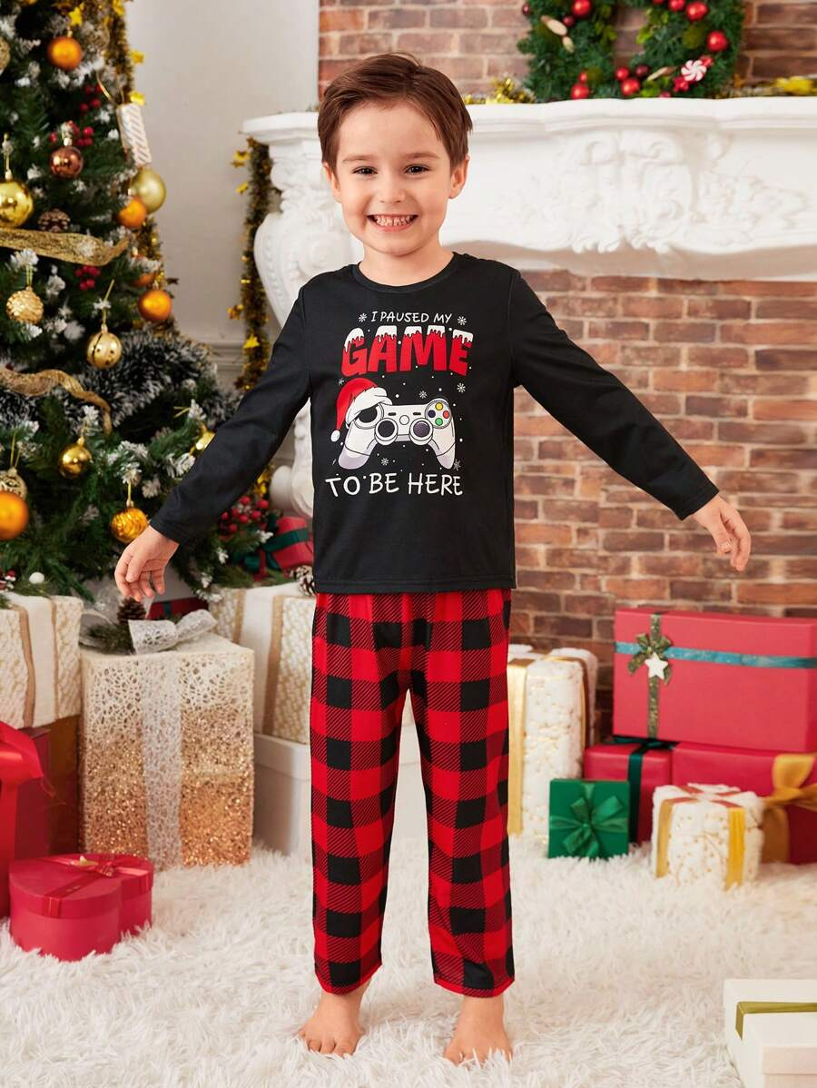 Add a playful twist to holiday lounging with the Letter and Game Pad Print Family Matching Pajamas Set! Featuring "Paused My Game" and reindeer prints on the tops, this set brings a fun, festive look for the whole family. The cozy round-neck top with regular long sleeves pairs effortlessly with classic red gingham plaid pants, creating a casual and stylish Christmas vibe. Crafted from soft, medium-stretch knitted fabric, it offers both comfort and flexibility.