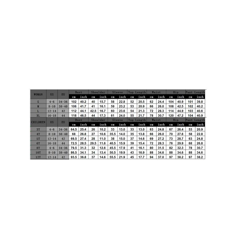 MomSize(cm)S Tops Length: 52 Bust: 102 Sleeve: 58 Pants Length: 101 Waist: 62 Hip: 104M Tops Length: 53 Bust: 106 Sleeve: 59 Pants Length: 102 Waist: 66 Hip: 108L Tops Length: 54 Bust: 112 Sleeve: 60 Pants Length: 103 Waist: 72 Hip: 114XL Tops Length: 55 Bust: 118 Sleeve: 61 Pants Length: 104 Waist: 78 Hip: 120XXL Tops Length: 56 Bust: 124 Sleeve: 62 Pants Length: 105 Waist: 94 Hip: 126Size(inch)S Tops Length: 20.47 Bust: 40.16 Sleeve: 22.83 Pants Length: 39.76 Waist: 24.41 Hip: 40.94M Tops Length: 20.87 Bust: 41.73 Sleeve: 23.23 Pants Length: 40.16 Waist: 25.98 Hip: 42.52L Tops Length: 21.26 Bust: 44.09 Sleeve: 23.62 Pants Length: 40.55 Waist: 28.35 Hip: 44.88XL Tops Length: 21.65 Bust: 46.46 Sleeve: 24.02 Pants Length: 40.94 Waist: 30.71 Hip: 47.24XXL Tops Length: 22.05 Bust: 48.82 Sleeve: 24.41 Pants Length: 41.34 Waist: 37.01 Hip: 49.61 KidSize(cm)3T Tops Length: 33 Bust: 64.5 Sleeve: 33 Pants Length: 53 Waist: 63 Hip: 674T Tops Length: 35 Bust: 68 Sleeve: 35.5 Pants Length: 58 Waist: 66 Hip: 705T Tops Length: 37 Bust: 69.5 Sleeve: 38 Pants Length: 63 Waist: 69 Hip: 736T Tops Length: 39 Bust: 72.5 Sleeve: 40.5 Pants Length: 68 Waist: 72 Hip: 768T Tops Length: 41 Bust: 86.5 Sleeve: 45.5 Pants Length: 78 Waist: 80 Hip: 8210T Tops Length: 43 Bust: 89.5 Sleeve: 50.5 Pants Length: 88 Waist: 88 Hip: 8812T Tops Length: 45 Bust: 93.5 Sleeve: 55 Pants Length: 97 Waist: 94 Hip: 97Size(inch)3T Tops Length: 12.99 Bust: 25.39 Sleeve: 12.99 Pants Length: 20.87 Waist: 24.80 Hip: 26.384T Tops Length: 13.78 Bust: 26.77 Sleeve: 13.98 Pants Length: 22.83 Waist: 25.98 Hip: 27.565T Tops Length: 14.57 Bust: 27.36 Sleeve: 14.96 Pants Length: 24.80 Waist: 27.17 Hip: 28.746T Tops Length: 15.35 Bust: 28.54 Sleeve: 15.94 Pants Length: 26.77 Waist: 28.35 Hip: 29.928T Tops Length: 16.14 Bust: 34.06 Sleeve: 17.91 Pants Length: 30.71 Waist: 31.50 Hip: 32.2810T Tops Length: 16.93 Bust: 35.24 Sleeve: 19.88 Pants Length: 34.65 Waist: 34.65 Hip: 34.6512T Tops Length: 17.72 Bust: 36.81 Sleeve: 21.65 Pants Length: 38.19 Waist: 37.01 Hip: 38.19 Specification:Name: Mommy and Me Matching PajamasMaterial: 95%Elastane and 5%CottonPattern: Bow Stripe/Heart Package Contents1* Tops + 1* Pants Friendly Tips:1. Please kindly allow a 2-3% difference according to manual measurement.2. Please check the measurement chart carefully before you buy the item. (1 inch = 2.54 cm)3. Please note that a slight color difference should be acceptable due to the light and screen. Thanks. PromiseIf the product has any quality problems, please tell us, and we will help you solve the problem as quickly as possible.