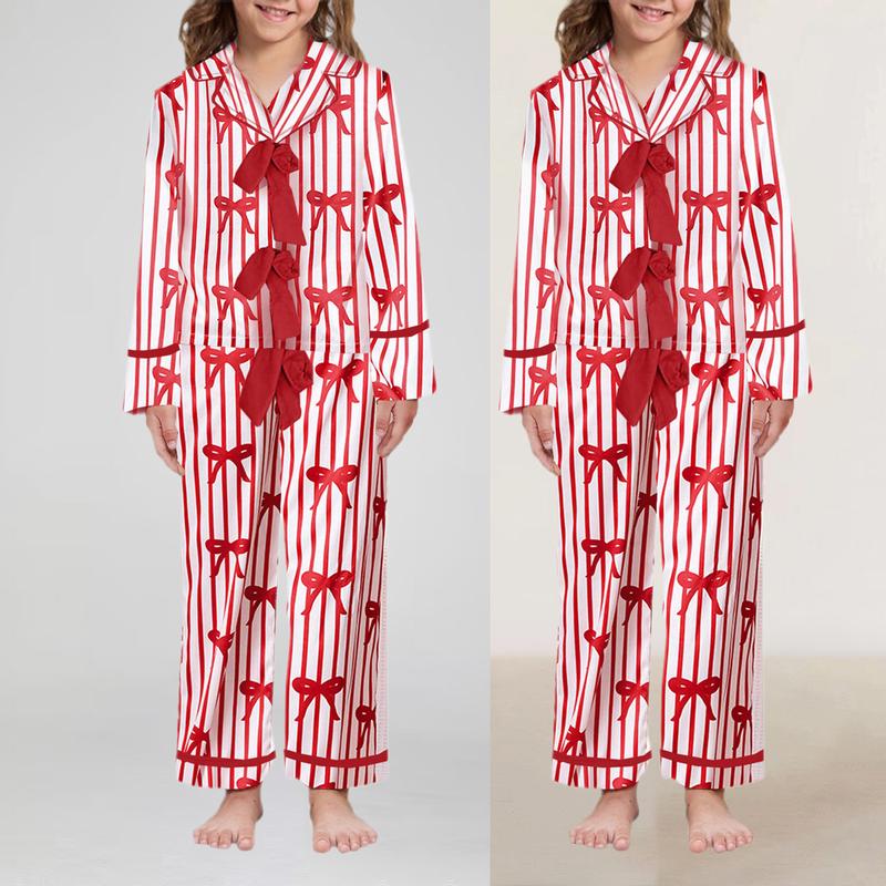 • Mommy and Me Matching Loose Pajamas Bow/Heart Print Tie Front Long Sleeve Tops and Long Pants Set Holiday Family Matching Homewear Sleepwear