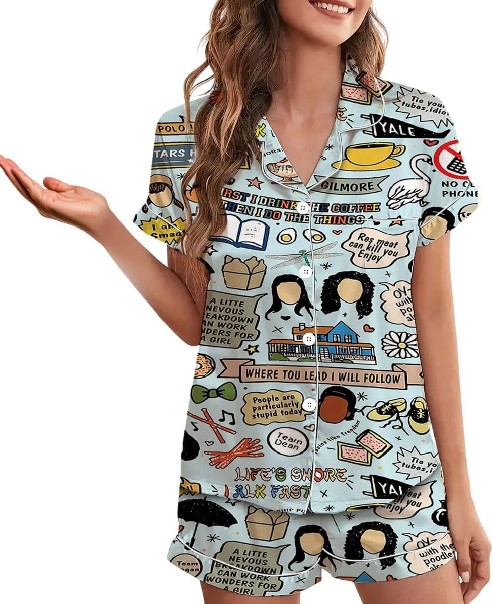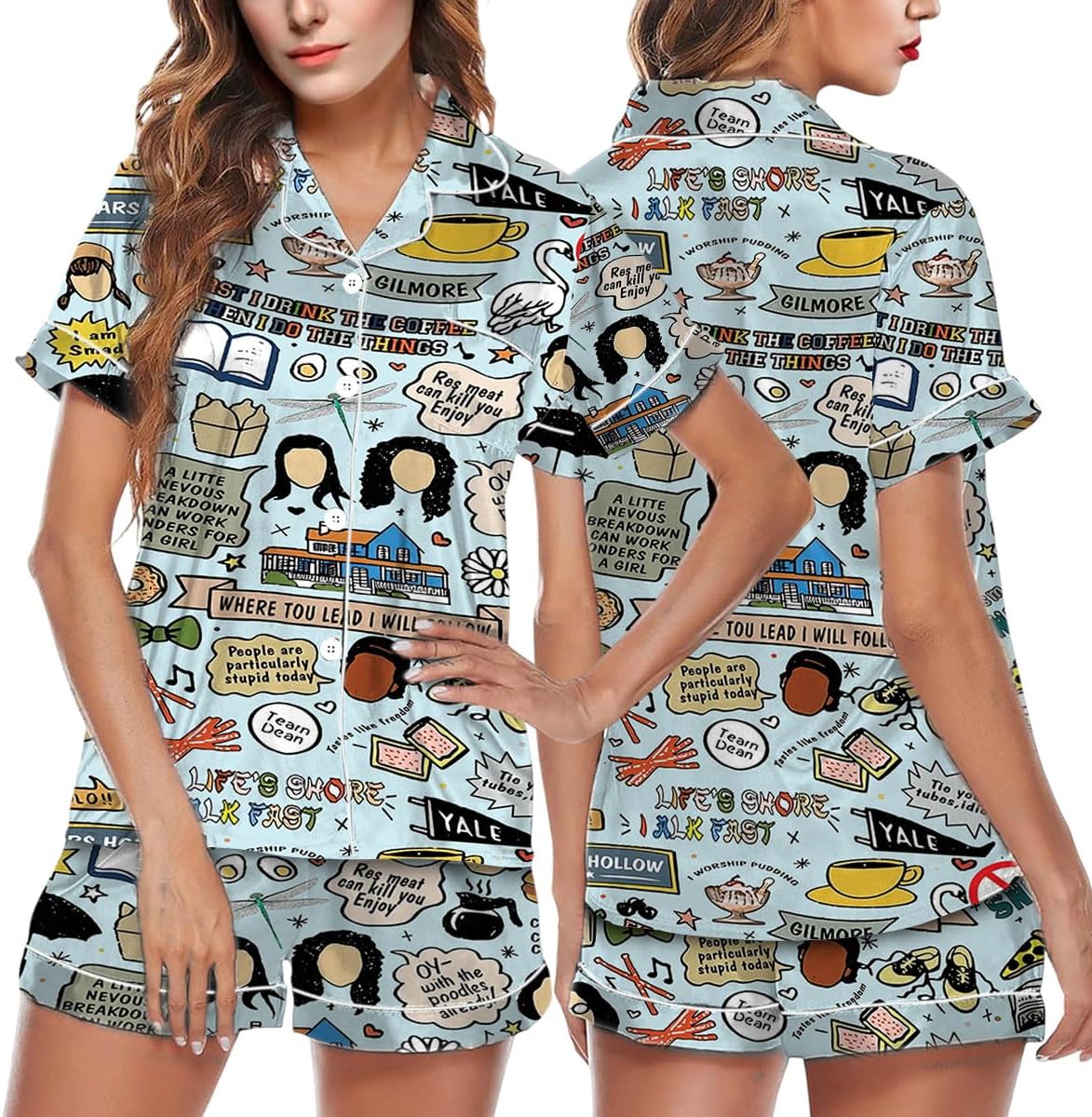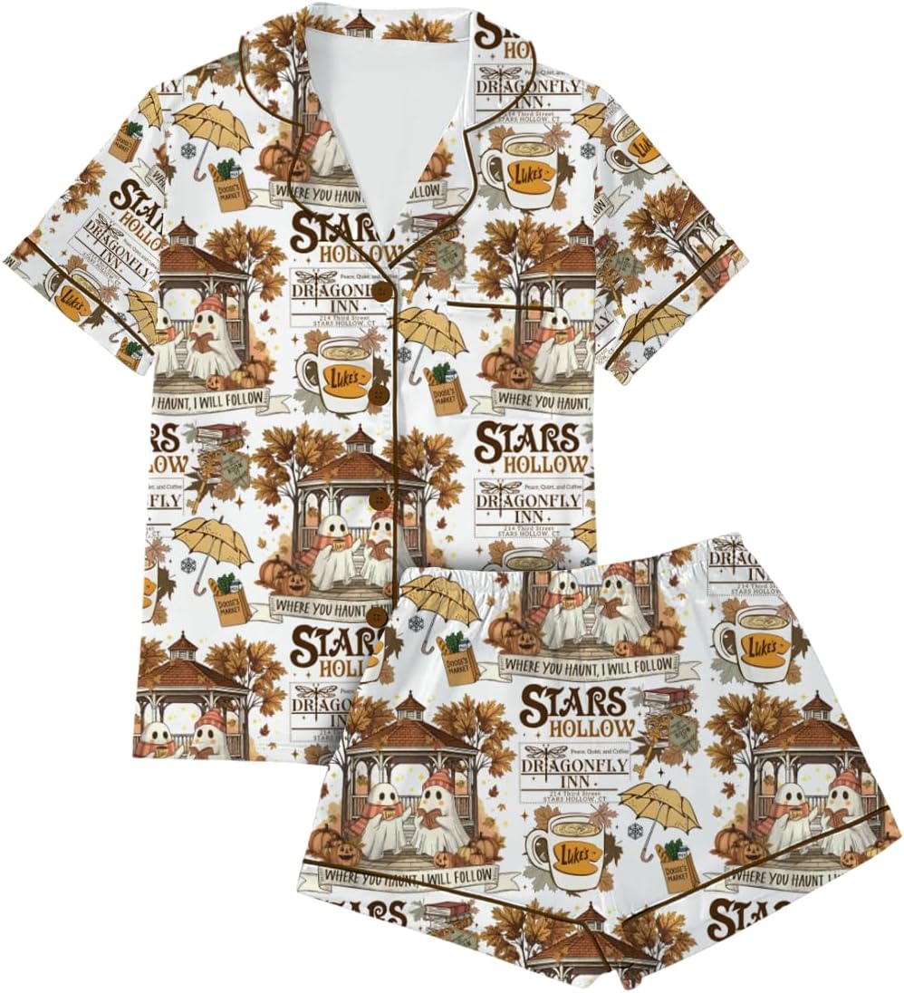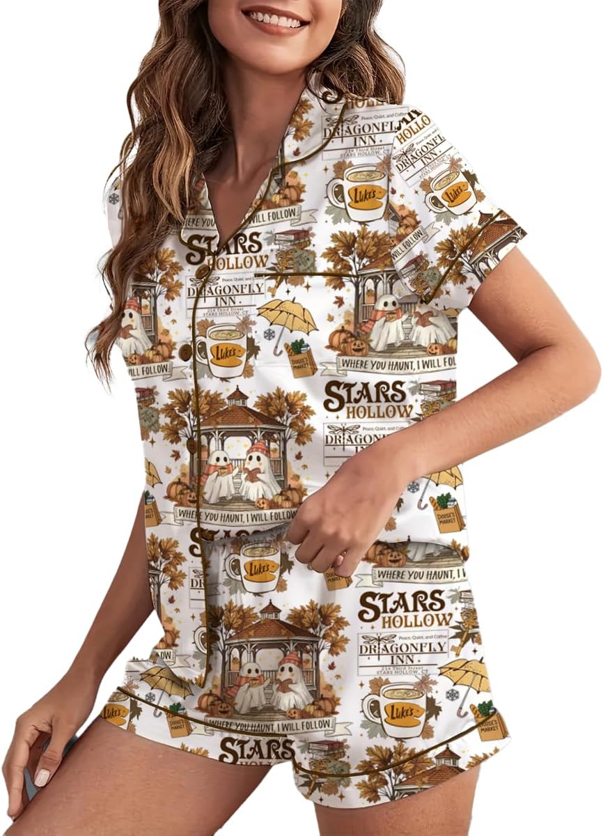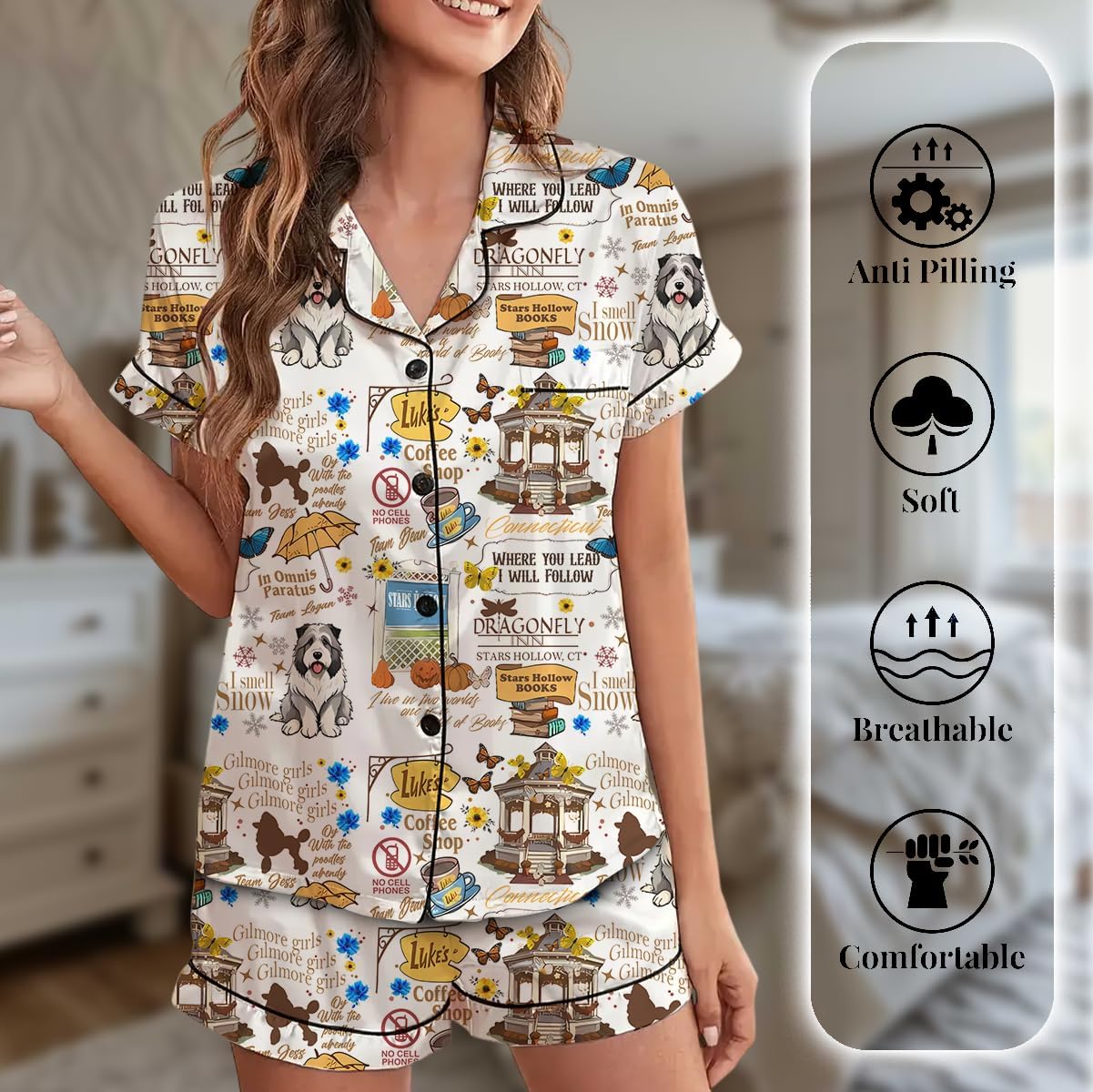 Design: Loungewear sets woman features a cute dog print on a classic silhouette, blending elegance with a touch of whimsy, The button-down top and elastic-waist shorts with side pockets offer lightweight comfort for effortless lounging