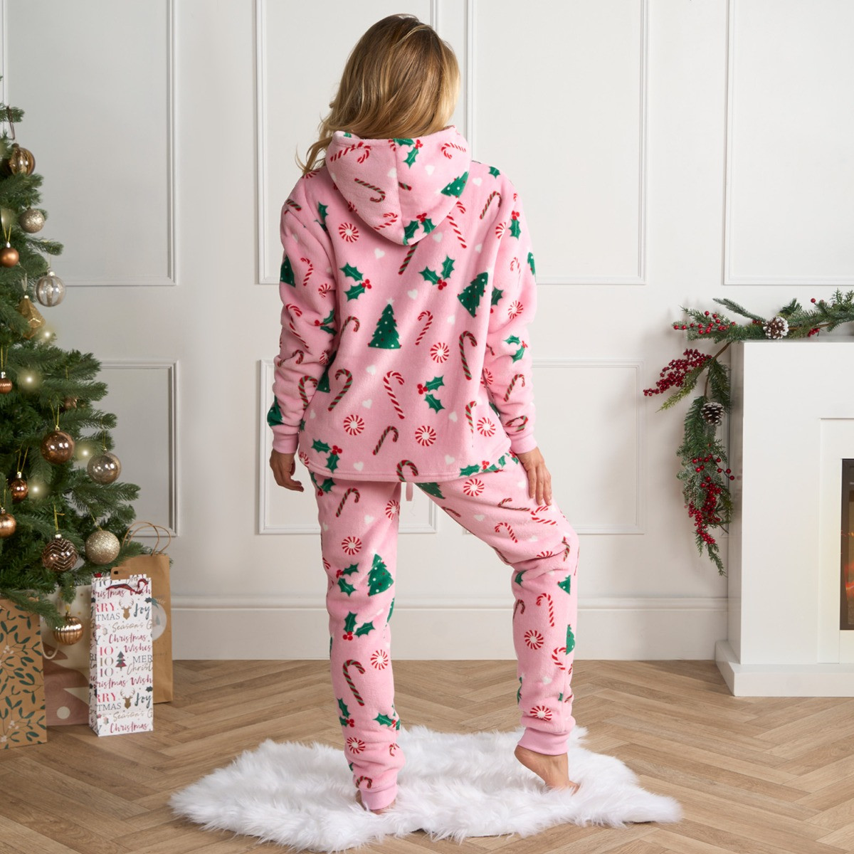 Introducing the OHS Adults Christmas Candy Cane Fleece Hoodie Pyjama Set, the perfect festive loungewear for the holiday season. This charming set features a playful candy cane pattern on a soft pink background, capturing the joyful spirit of Christmas. Made from cosy fleece, it includes a warm hoodie and matching pyjama bottoms, ensuring you stay snug and comfortable on chilly winter nights. Celebrate the season in style and comfort with the OHS Christmas Candy Cane Fleece Hoodie Pyjama Set, ideal for relaxing at home during the holidays.
