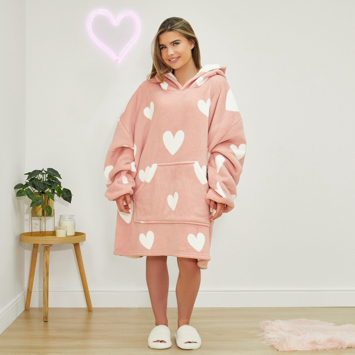 Ready for a comfy night in, this OHS Heart Print Hooded Blanket is your new comfort buddy! Featuring a sumptuously soft touch with a stylish heart print on the outer fabric and a soft sherpa lining. Expertly matched with elastic cuffs and a double opening front sherpa lined pocket, this will make a fantastic gift for friends and family. Crafted for optimum ease this is a durable, one-step care garment, used as a wearable sweatshirt. Simply wash at 30 degrees. One size fits all with this product and it is ideal for relaxing, working from home or taking with you to outdoor events.